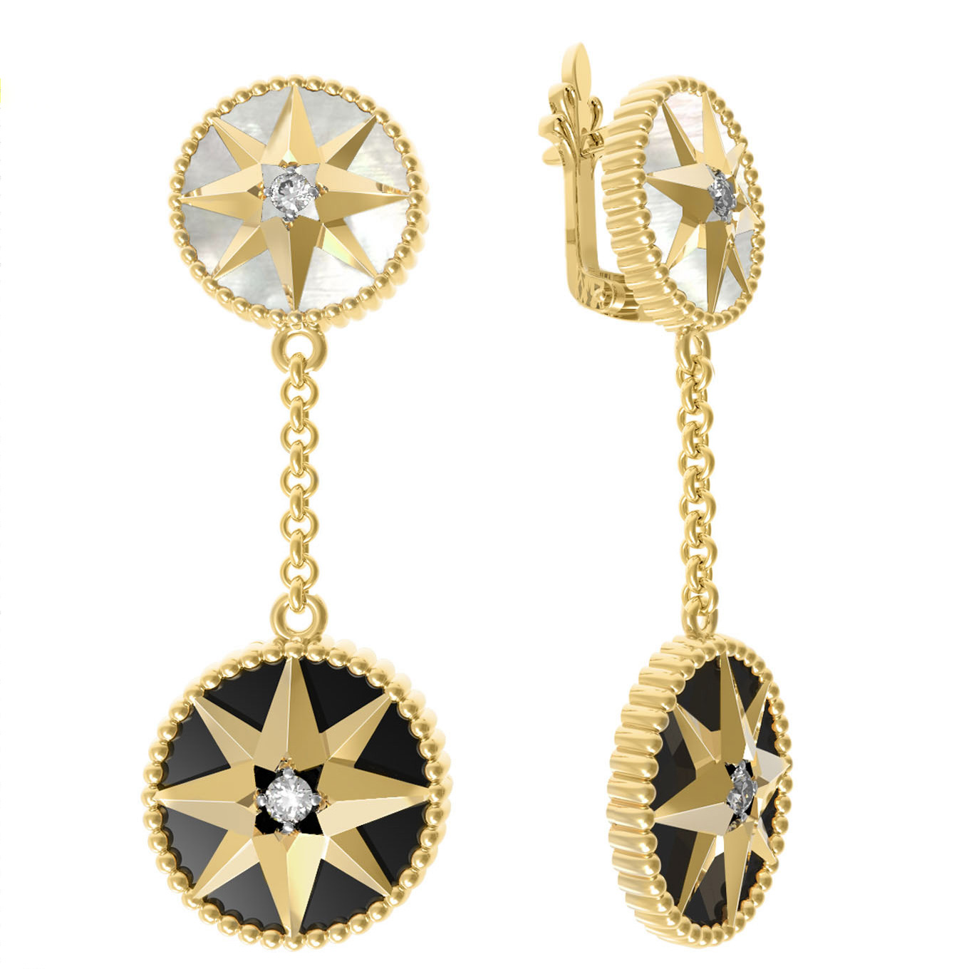 Серьги из лимонного золота c фианитом, ониксом и перламутром