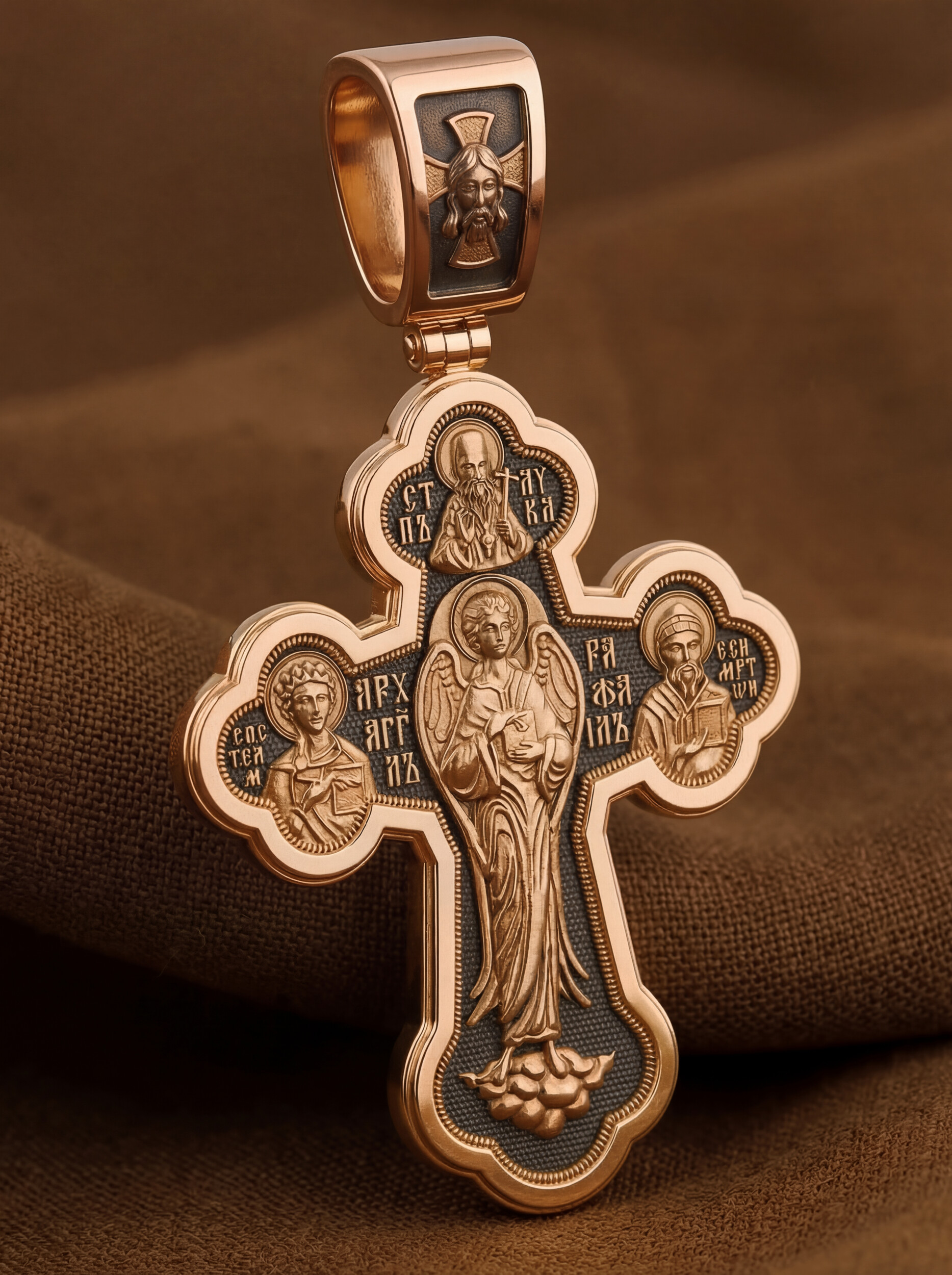 В центре на обороте креста изображен могущественный Архангел Рафаил (Исцеление Божие) — целитель человеческих недугов, путеводитель и врач Божий. Он один из семи высших архангелов, самых близких к Богу. Вокруг Рафаила помещены иконы великих целителей, которых Церковь почитает как чудотворцев. Слева — Великомученик Пантелеимон Целитель — безмездный врач, который за свою глубокую, сострадательную любовь к людям был награжден Богом великой целительной силой. Святой воскрешал людей и исцелял именем Христа любые болезни. Справа — Святитель Спиридон Тримифунтский — один из самых почитаемых святых в Греции. Почитается он и в России как великий целитель всяческих недугов, помощник в бизнесе, покровитель христианских семей. В оглавии оборота креста помещена икона новопрославленного Святого Луки, архиепископа Симферопольского и Крымского.