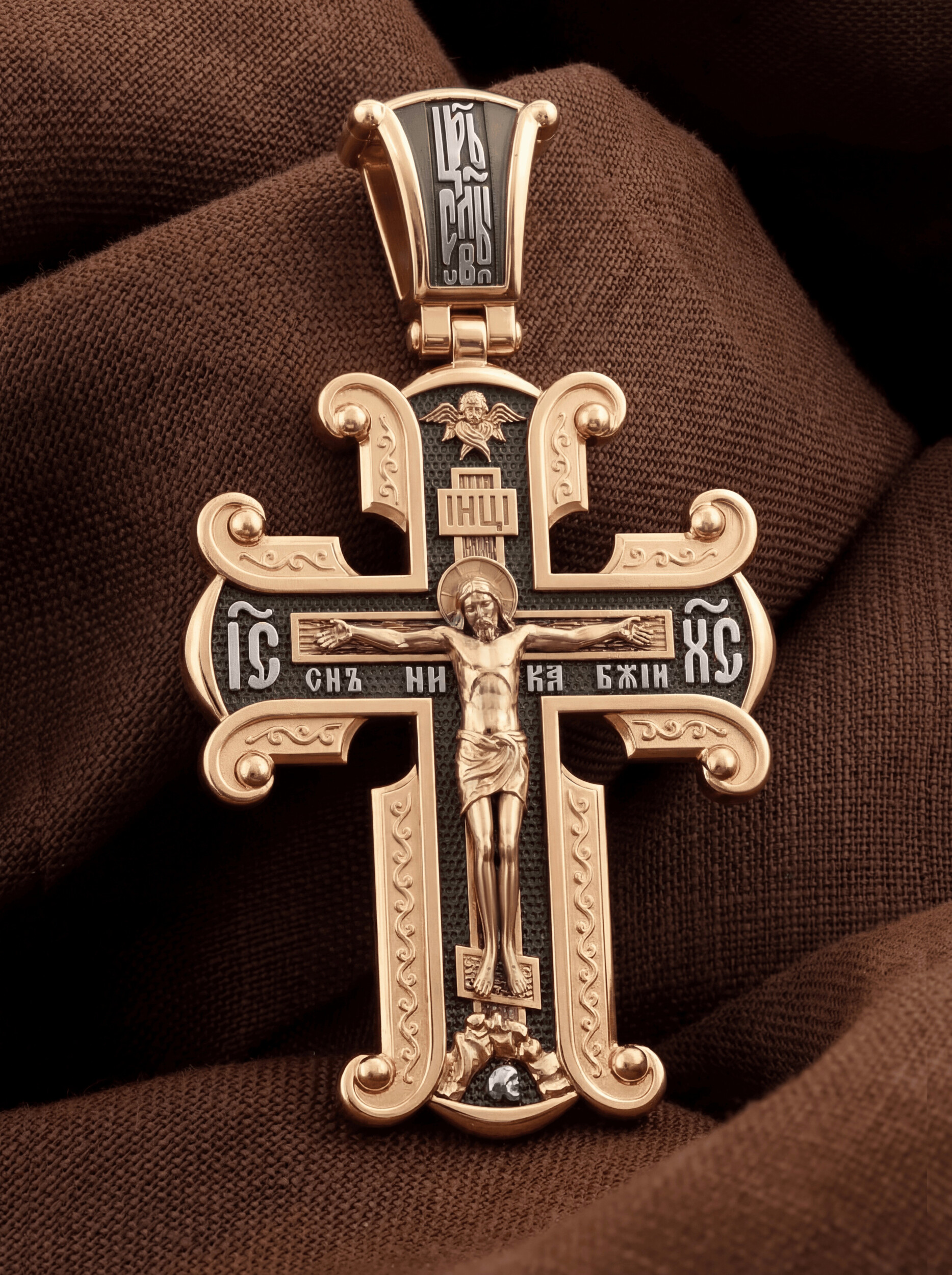 На лицевой стороне необычной формы нательного креста мы видим распятие Господне. Сам крест украшен плетением полурастительной тематики и золотым ободком, заканчивающимся завитками. На кулонном кольце с лицевой стороны надпись — Царь Славы. Под ней — шестикрылый огненный серафим, и буквы «IНЦI», означающие Иисус Назорей Царь Иудейский. С обеих сторон горизонтальной перекладины надписи — монограмма Святого имени Христа — «ИС ХС», а под ней — «НИКА» (Победитель) и «Сын Божий». В подножии мы видим изображенную гору Голгофу в виде скалистой горки с Главой Адамовой в пещере.