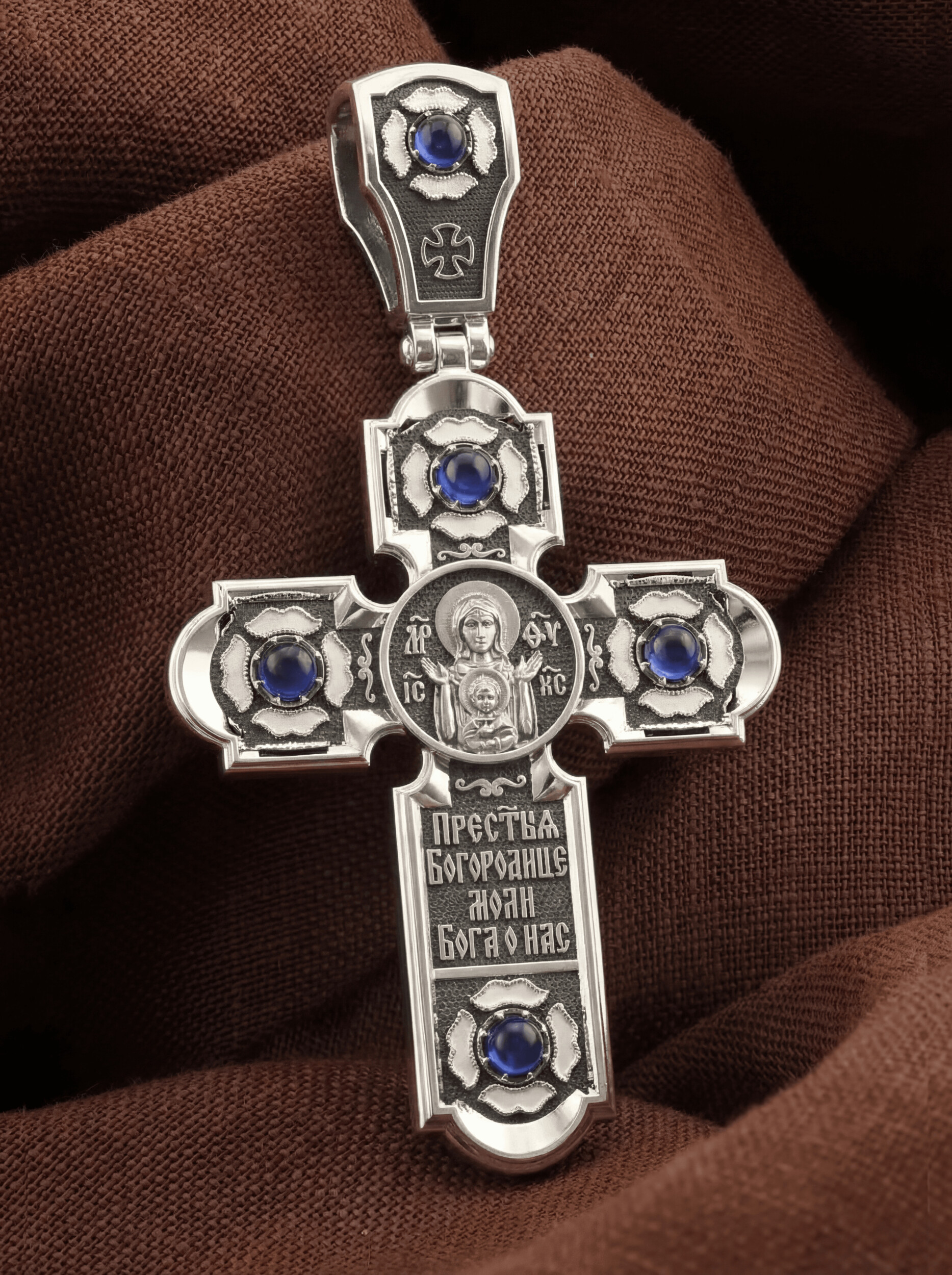 На оборотной стороне креста изображена икона Божией Матери «Знамение». Икона изображает Пресвятую Богородицу, молитвенно поднимающую Свои руки: на груди Ее, на фоне круглого щита, — благословляющий Божественный Младенец — Спас-Эммануил. Богоматерь изображена по пояс. Иконы Божией Матери, известные под именем «Знамение», появились на Руси в XI — XII веках, а называться так стали после чудесного знамения от Новгородской иконы, случившегося в 1170 году. Многочисленные списки с иконы Знамения известны по всей России. Многие из них просияли чудесами в местных храмах и были наименованы по месту явления чудес.