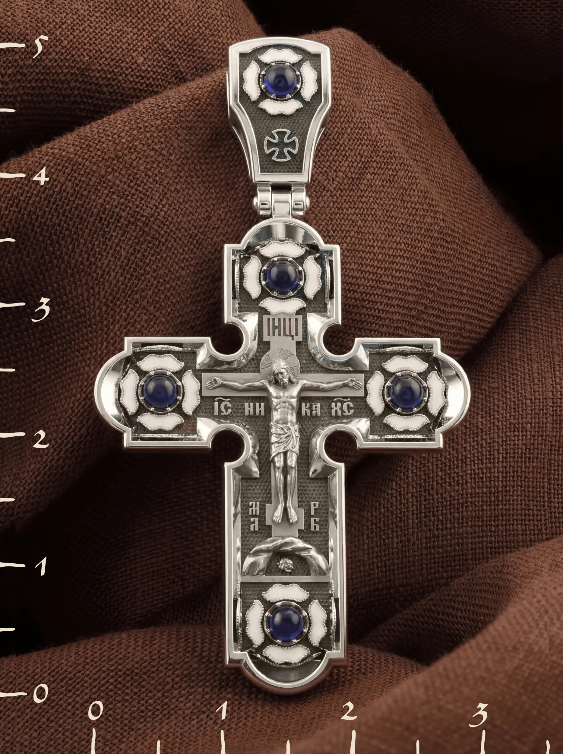 На лицевой стороне креста изображено Распятие Господа и Спасителя нашего Иисуса Христа. Христос, подвергнутый на кресте мучительной казни, своими страданиями искупил нас от древнего греха и даровал нам жизнь вечную. На верхней табличке, выше головы Иисуса, расположена надпись, составленная Понтием Пилатом — «IНЦI». Она означает «Иисус Назорей, Царь Иудейский». Надпись «IС» « ХС» означает Иисус Христос и слово «НИКА», что означает «победитель», помещаются на разных сторонах поперечной перекладины креста. В нижней части креста находится надпись «МЛРБ» — «место лобное рай бысть» означает, что место лобное стало раем. Крест стоит на горе камней, символизирующих Голгофу. Под подножием Креста изображена покоящаяся голова (череп) Адама, грехи которого Христос омыл Своею Кровью. Христос в Своей Божественной любви, над которой смерть не властна и которая, страдая, и не страдает в обычном смысле, простирает к людям со Креста Свои объятия, в которые призывается и привлекается весь мир.