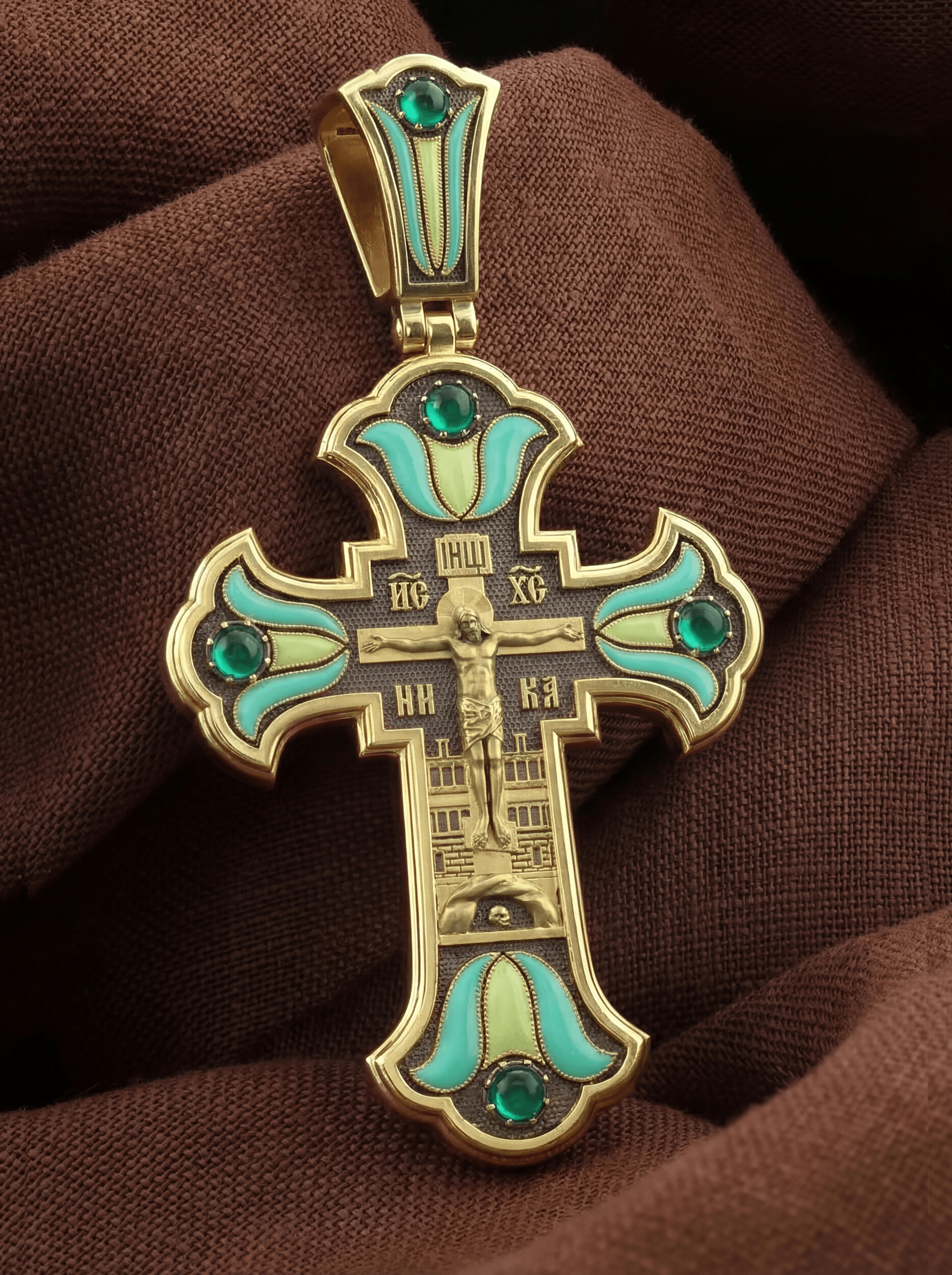 На лицевой стороне креста изображено Распятие Господа и Спасителя нашего Иисуса Христа. Христос, подвергнутый на кресте мучительной казни, своими страданиями искупил нас от древнего греха и даровал нам жизнь вечную. На верхней табличке, выше головы Иисуса, расположена надпись, составленная Понтием Пилатом — «IНЦI». Она означает «Иисус Назорей, Царь Иудейский». Надписи «IС» « ХС» означает Иисус Христос и слово «НИКА», что означает «победитель», помещается на разных сторонах поперечной перекладины креста. За крестом высится Иерусалимская стена, в знак того, что Господь был распят вне стен города. Крест стоит на горе камней, символизирующих Голгофу. Под подножием Креста изображена покоящаяся голова (череп) Адама, грехи которого Христос омыл Своею Кровью.