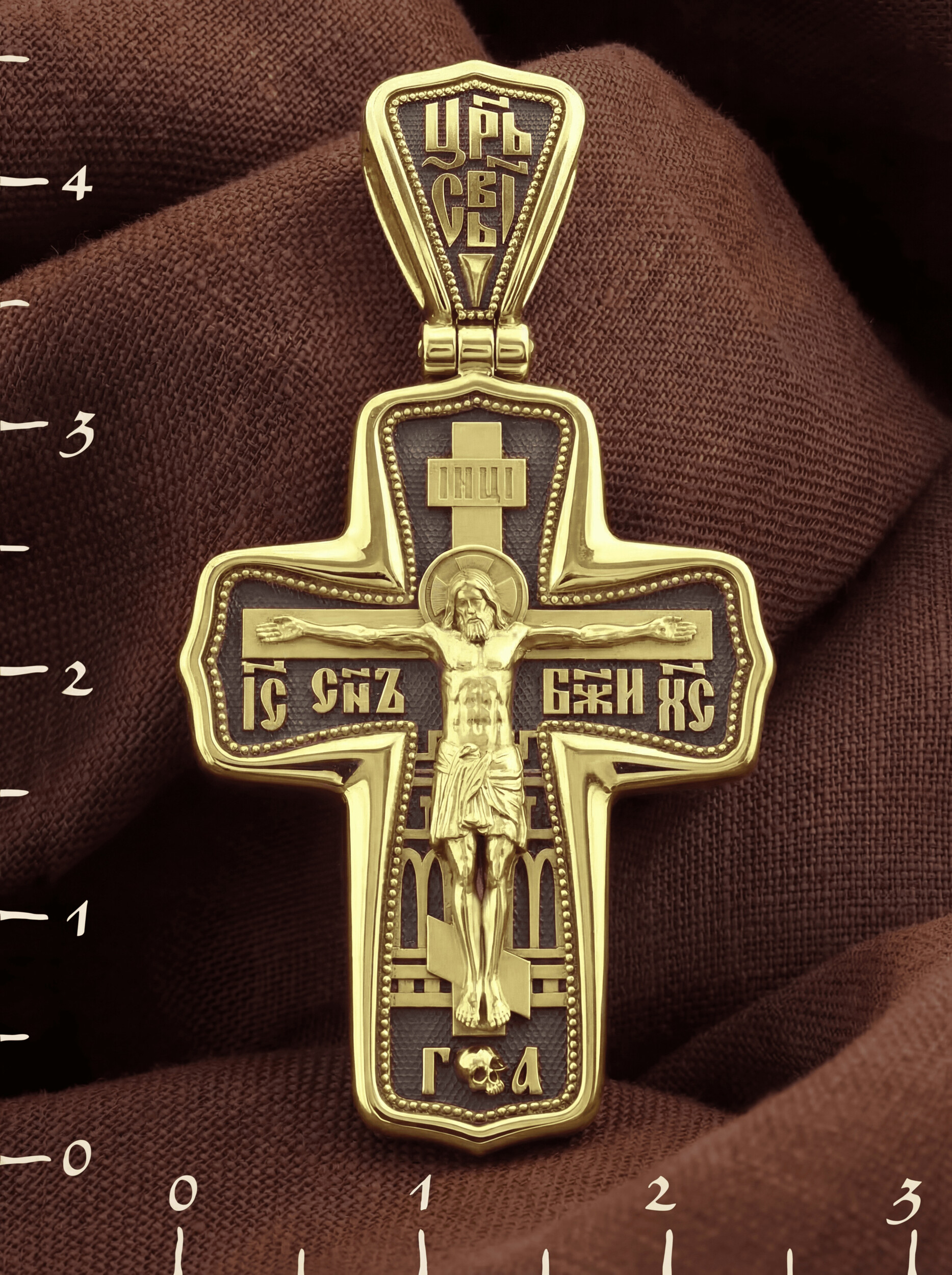 На лицевой стороне креста изображено Распятие Господа и Спасителя нашего Иисуса Христа. Крест- символ спасения и искупления рода человеческого, знамение победы над смертью и адом. Он стал символом восстания из мертвых и обретения вечной жизни в Царствии Иисуса Христа, величайшим символом силы и власти Христовой. Иисус Христос, как искупительная жертва освобождения человечества от власти греха, умер крестной смертью и в третий день воскрес. На верхней табличке, выше головы Иисуса, расположена надпись, составленная Понтием Пилатом — «IНЦI». Она означает «Иисус Назорей, Царь Иудейский». На кулонном кольце помещена надпись «Царь Славы». Надпись «IС» « ХС» означает Иисус Христос и помещается на разных сторонах поперечной перекладины креста. Рядом расположена надпись «Сын Божий». За крестом высится Иерусалимская стена. Ниже подножия креста различается череп и надпись «Г.А» — это глава Адамова. На православном кресте Христос не умирает, а свободно простирает руки, ладони Иисуса открыты, будто он хочет обнять все человечество, даря им свою любовь и открывая путь к вечной жизни.