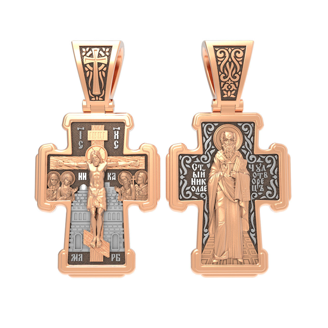 На лицевой стороне креста изображено Распятие Господа и Спасителя нашего Иисуса Христа. Крест- символ спасения и искупления рода человеческого, знамение победы над смертью и адом. Иисус Христос, как искупительная жертва освобождения человечества от власти греха, умер крестной смертью и в третий день воскрес. На верхней табличке, выше головы Иисуса, расположена надпись, составленная Понтием Пилатом — «IНЦI». Она означает «Иисус Назорей, Царь Иудейский». Рядом расположена надпись «IС» « ХС». Она означает Иисус Христос. Ниже — слово «НИКА», что означает «победитель». Слева от Распятия — Пресвятая Богородица и святая мироносица Мария Магдалина с крестом в руке. Справа — апостол и евангелист Иоанн Богослов, один из ближайших учеников Иисуса Христа, и сотник Лонгин с крестом в правой руке и копьем — в левой. За крестом высится Иерусалимская стена. Надпись «МЛРБ» — «место лобное рай бысть» означает, что место лобное стало раем, помещается в нижней части креста. На кулонном кольце помещен крест.