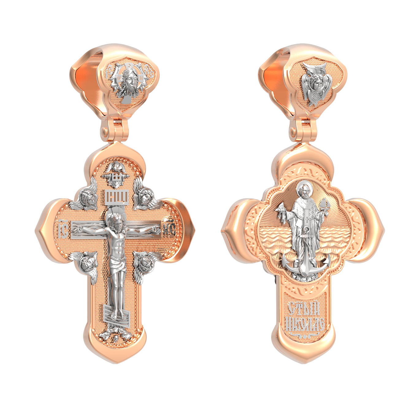 На лицевой стороне креста изображено Распятие Господа и Спасителя нашего Иисуса Христа, отдавшего Себя на смерть, для искупления грехов мира. Крест является символом жертвенной любви Всеблагого Бога к падшим людям, всепобеждающим духовным оружием христиан, основанием и средоточием церковной жизни. Господь сказал: «кто хочет идти за Мною, отвергнись себя, и возьми крест свой, и следуй за Мною». (Мк. 8: 34). На верхней табличке, выше головы Иисуса, расположена надпись, составленная Понтием Пилатом — «IНЦI». Она означает «Иисус Назорей, Царь Иудейский». Надпись «IC» «ХC», означает Иисус Христос, помещается на разных сторонах поперечной перекладины креста. Крест стоит на горе камней, символизирующих Голгофу. В ее основании различается череп– это голова Адама. На кулонном кольце изображен Нерукотворный образ Господа и Спасителя нашего Иисуса Христа, чудесно отпечатавшийся на плате, которым Христос вытер свой лик.