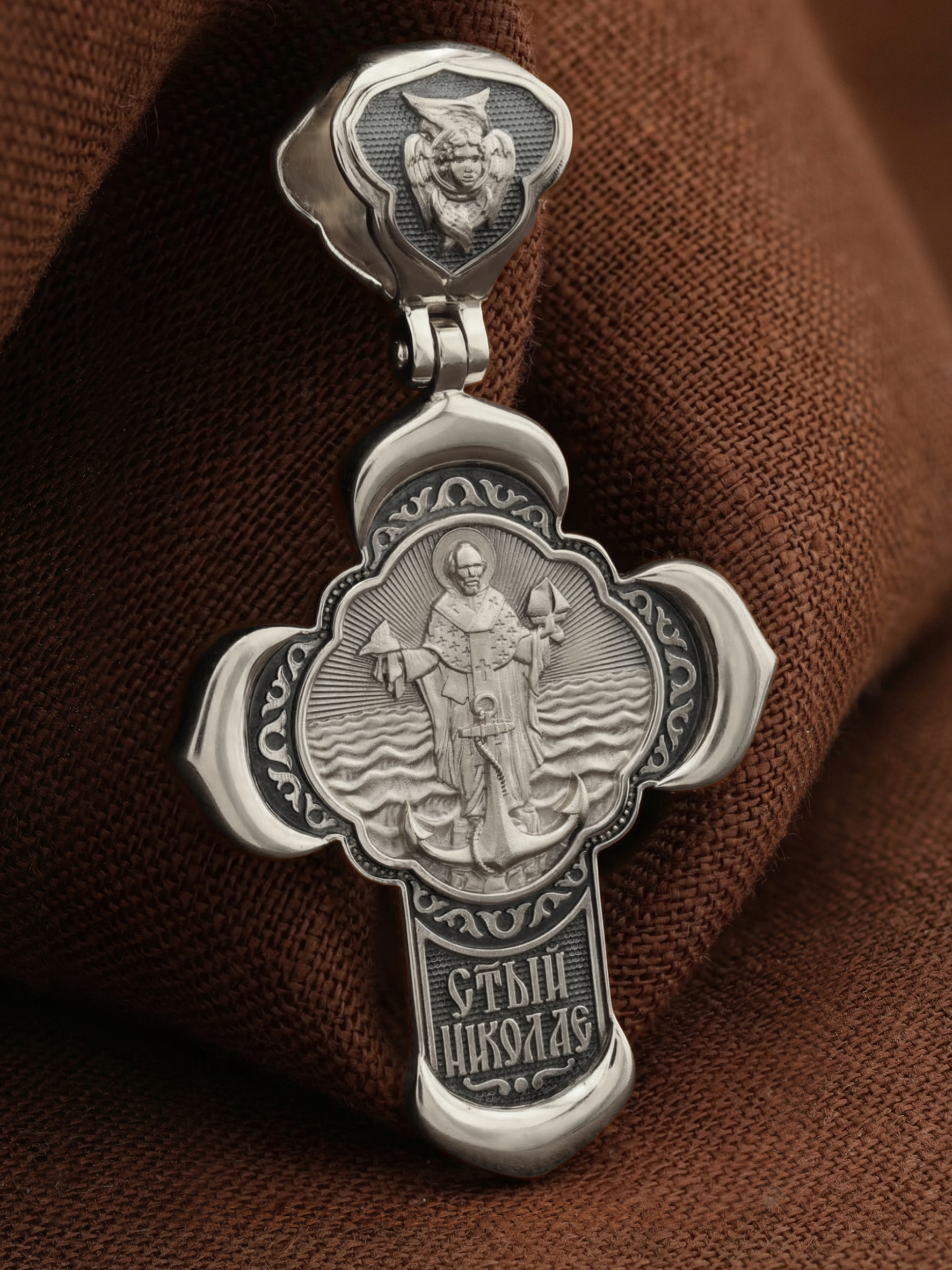 На оборотной стороне креста изображена икона Святителя Николая архиепископа Мир Ликийских, Чудотворца. В правой руке Святителя Николая изображен мыс Горн, а в левой — корабль. Он стоит на возвышенности среди бушующих волн и впереди изображен большой якорь. Эта икона была написана путешественником и священником Фёдором Конюховым. Во время одного из своих кругосветных путешествий, проходя пролив Дрейка, Фёдор, понимая, что выжить в такой бушующей стихии невозможно, стал молиться Святителю Николаю Чудотворцу. Он мысленно пообещал себе: «если пройду мыс Горн, то построю часовню Николаю Чудотворцу»… И в следующий миг, совсем неожиданно — волны утихли. Яхта Конюхова благополучно прошла опасный участок пути. Вернувшись домой, Фёдор Конюхов построил часовню в благодарность за свое спасение. Святитель Николай является одним из самых известных на Руси святых, издревле считающийся помощником и молитвенником за всех, притекающих к нему. Николай Чудотворец подавал многим исцеления в болезнях и телесных недугах, обогащал бедствующих в крайней нищете, подавал голодным пищу, спасал от потопления, освобождал из плена и избавлял от смерти. Чудес его исчислить невозможно.