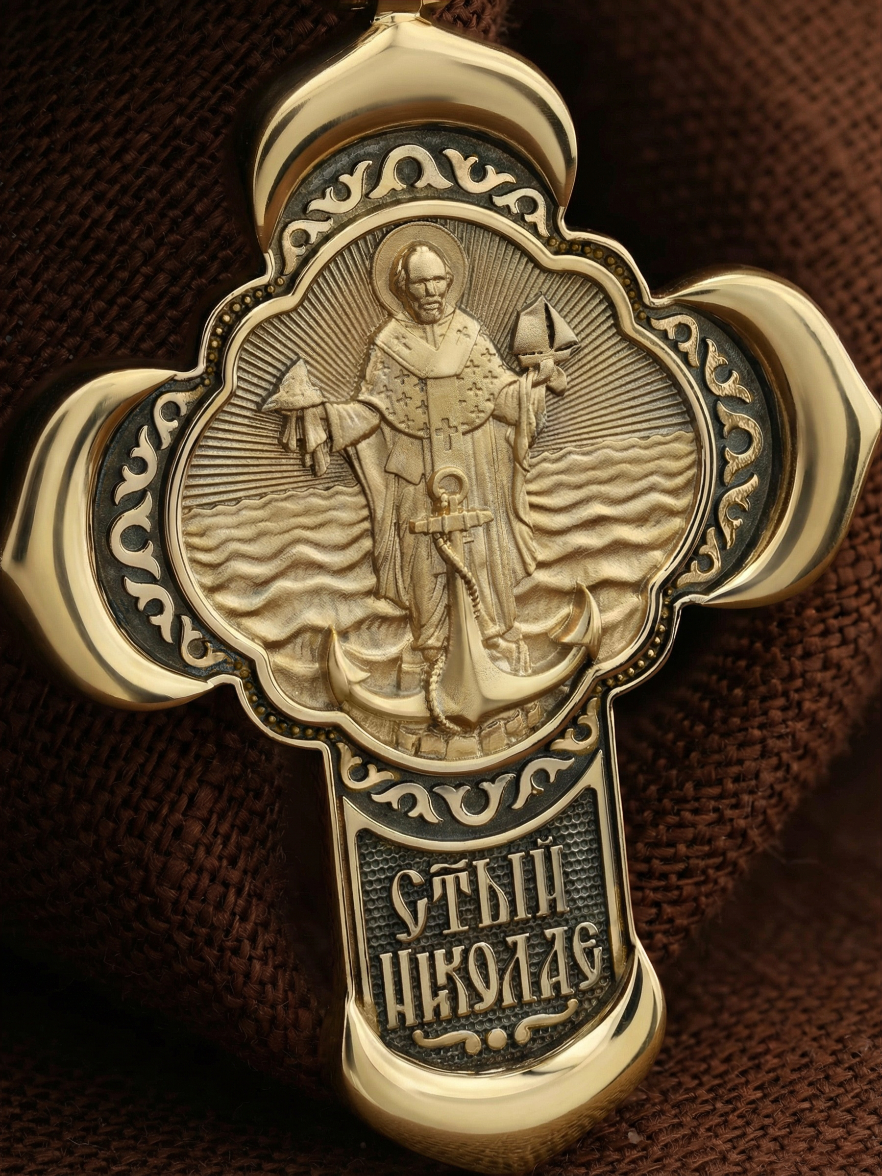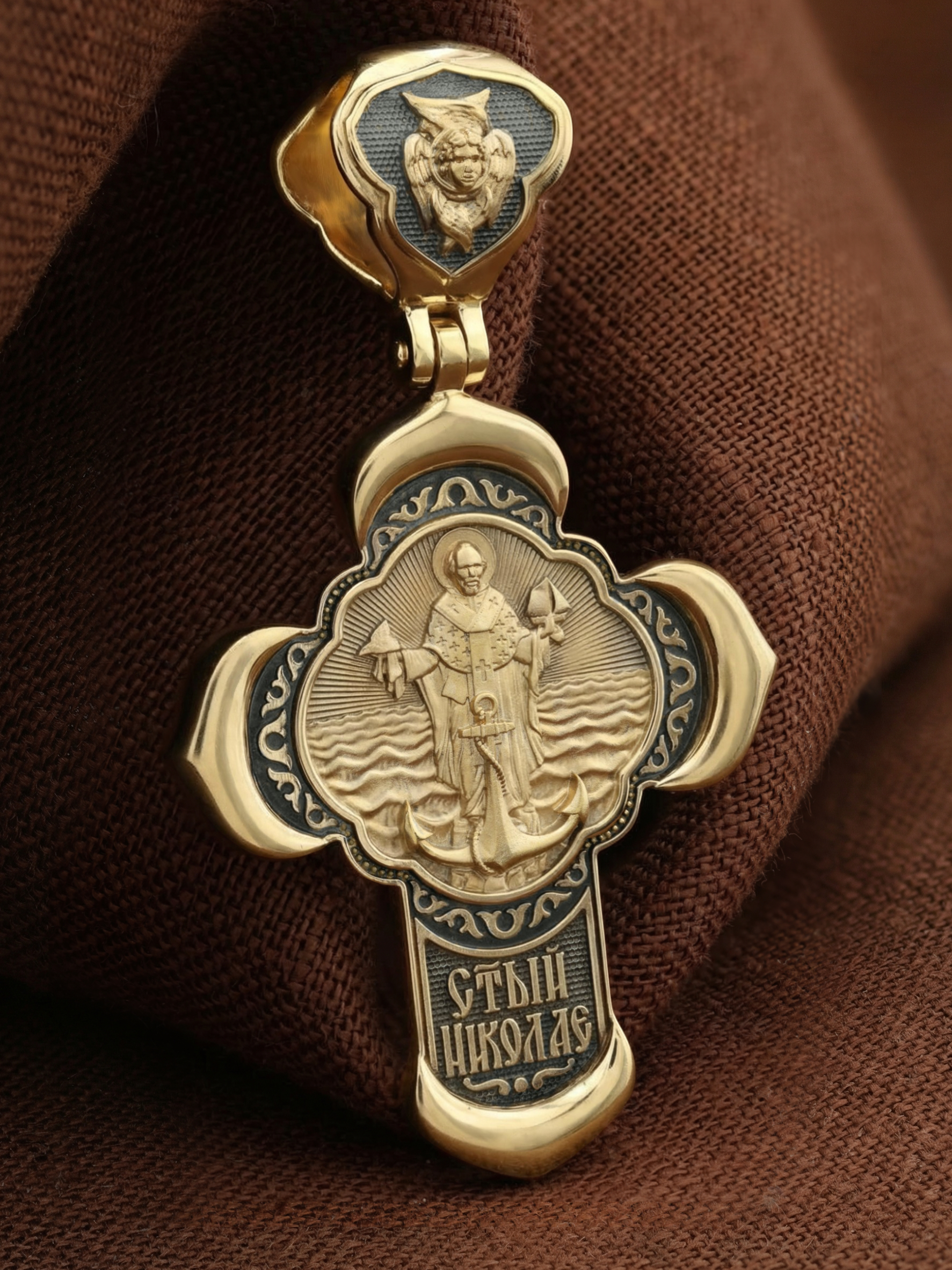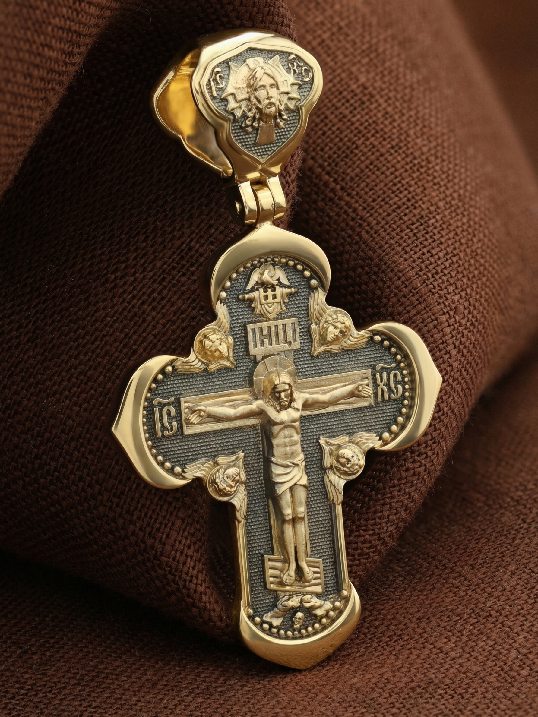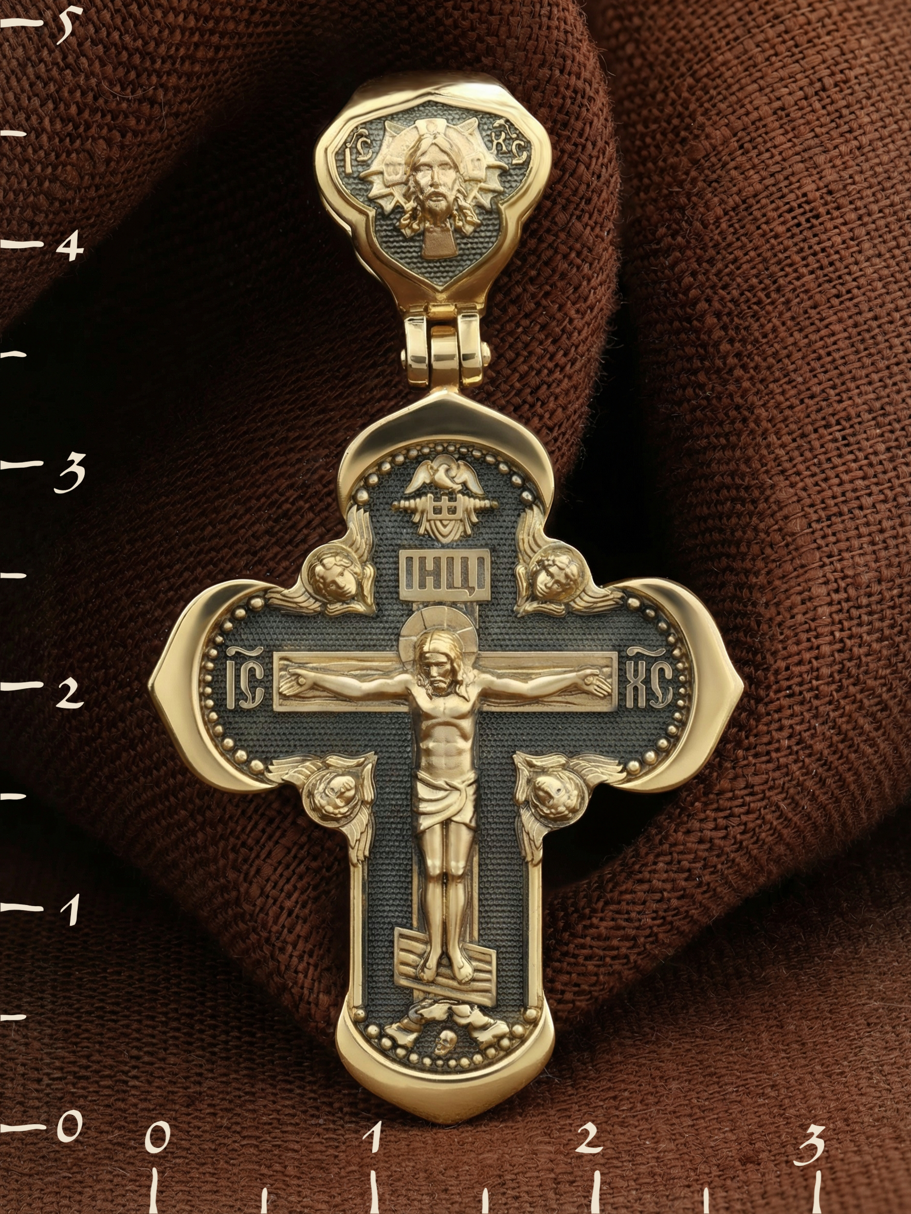 На лицевой стороне креста изображено Распятие Господа и Спасителя нашего Иисуса Христа, отдавшего Себя на смерть, для искупления грехов мира. Крест является символом жертвенной любви Всеблагого Бога к падшим людям, всепобеждающим духовным оружием христиан, основанием и средоточием церковной жизни. Господь сказал: «кто хочет идти за Мною, отвергнись себя, и возьми крест свой, и следуй за Мною». (Мк. 8: 34). На верхней табличке, выше головы Иисуса, расположена надпись, составленная Понтием Пилатом — «IНЦI». Она означает «Иисус Назорей, Царь Иудейский». Надпись «IC» «ХC», означает Иисус Христос, помещается на разных сторонах поперечной перекладины креста. Крест стоит на горе камней, символизирующих Голгофу. В ее основании различается череп– это голова Адама. На кулонном кольце изображен Нерукотворный образ Господа и Спасителя нашего Иисуса Христа, чудесно отпечатавшийся на плате, которым Христос вытер свой лик.