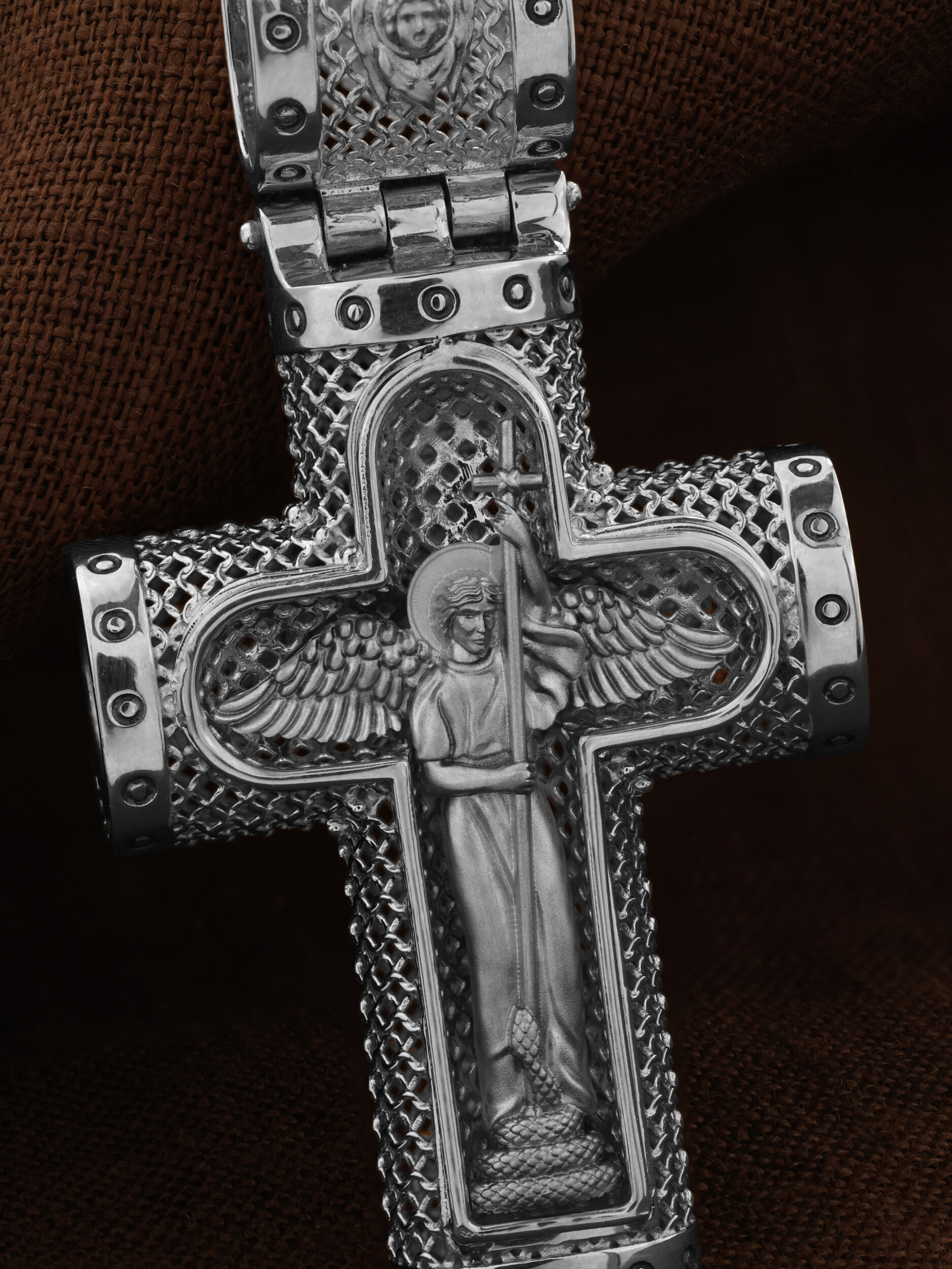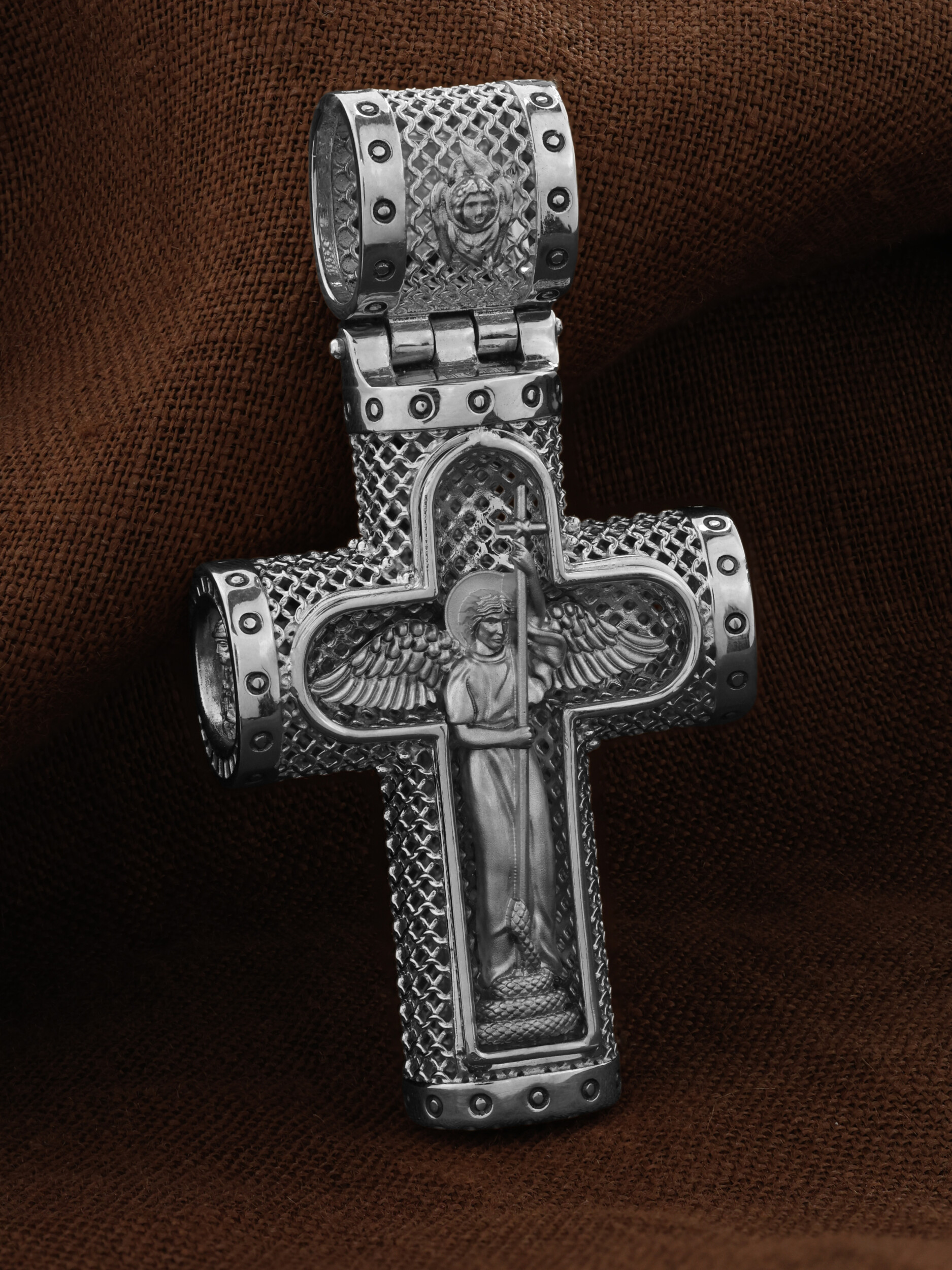На лицевой стороне креста изображено Распятие Господа и Спасителя нашего Иисуса Христа. Крест- символ спасения и искупления рода человеческого, знамение победы над смертью и адом. Иисус Христос, как искупительная жертва освобождения человечества от власти греха, умер крестной смертью и в третий день воскрес. Распятие сопровождается каноническими надписями. На верхней табличке, выше головы Иисуса, расположена надпись, составленная Понтием Пилатом — «IНЦI». Она означает «Иисус Назорей, Царь Иудейский». Надписи «IC» «ХC», означает Иисус Христос, «НИКА», что означает Победитель, «Царь Славы» и «Сын Божий», размещается на разных сторонах поперечной перекладины креста. Крест стоит на горе камней, символизирующих Голгофу, которая обозначена надписью «Г Г». В ее основании различается череп — это голова Адама, обозначенный надписью «Г А». Надпись «МЛРБ» — «место лобное рай бысть» означает место лобное стало раем. Вдоль креста изображены орудия Страстей Христовых: копие сотника Лонгина, которым пронзили подреберье мёртвого Иисуса, чтобы убедиться в Его смерти, и трость с губкой, с которой Иисуса напоили уксусом. Они обозначены буквами «К» и «Т». На кулонном кольце размещен «Нерукотворный образ Иисуса Христа», на оборотной стороне кулонного кольца- шестикрылый Серафим.