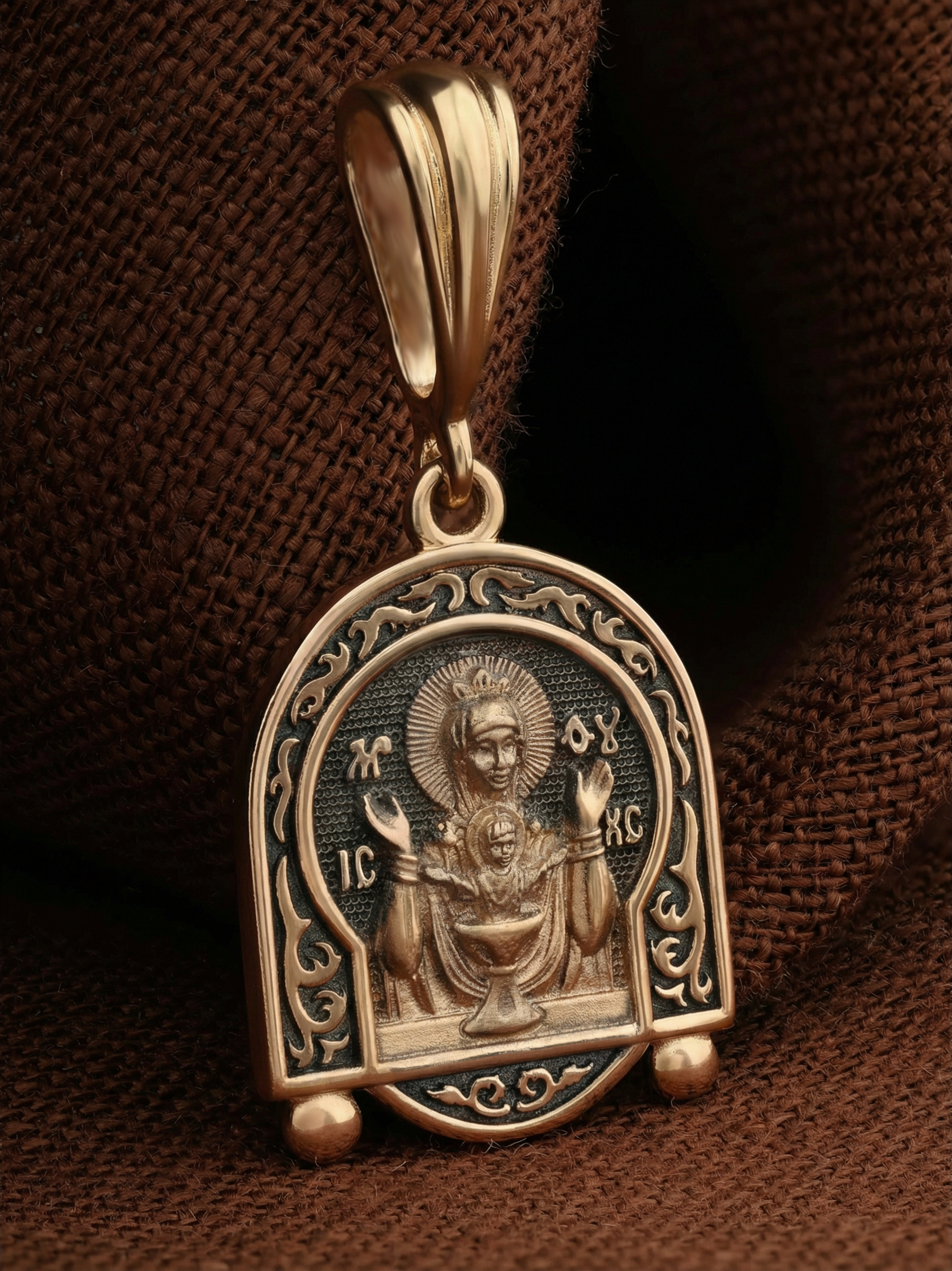 На лицевой части образка изображена икона Божией Матери «Неупиваемая чаша». Икона славится помощью в исцелении зависимостей, помогает людям обрести свободу от греховных страстей.