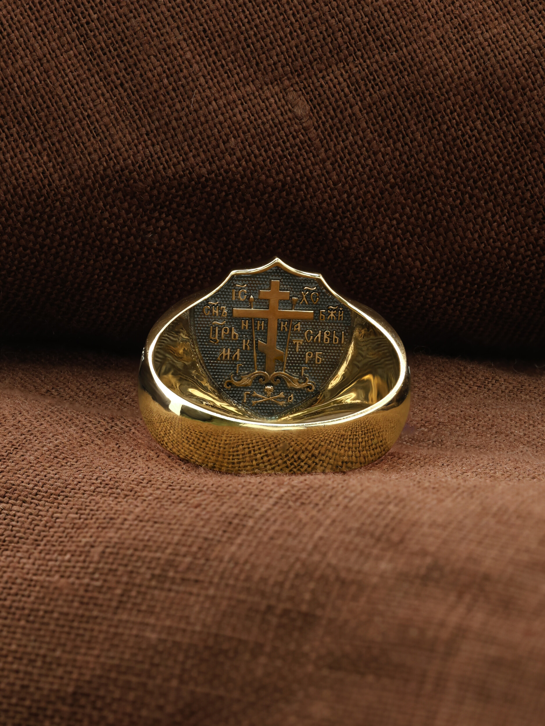 Кольцо «Святой Великомученик Георгий Победоносц» выполнено в древних христианских традициях. Основой композиции является изображение Святого Великомученика Георгия Победоносца — одного из самых почитаемых и удивительных святых. Георгий родился в Каппадокии (Малая Азия) в семье богатых и знатных горожан. Юношей поступил на службу к римскому императору Диоклетиану, за отличное знание военного дела и проявленную в боях и походах храбрость был приближен к императору и удостоен высокого воинского звания. Во время начавшихся гонений на христиан, перешел на сторону гонимых и, отвергнув человеческий страх, стал ярым проповедником учения Христа. Мучители подвергли опального воеводу жесточайшим восьмидневным пыткам и казнили его (обезглавили) в возрасте около тридцати лет в 303 году. На Руси он известен как Юрий или Егорий, заступник для верующих, чья жизнь имеет какое-либо отношение к военным делам, помощник в крестьянском труде. Георгий изображен как воитель, сидящий на вздыбленном коне и поражающий копьем огнедышащего змея. Справа над образом изображена благословляющая Божия десница. Змей символизирует собою сатанинские силы. Молитвами вознесенными к Всевышнему и своей непреклонной верой он смог одолеть чудовище. Святой убил змея, спас царскую дочь, принесенную в жертву, и жителей города, их души от влияния дьявола, породив в них надежду и веру в Господа, призывая людей принять христианскую веру.