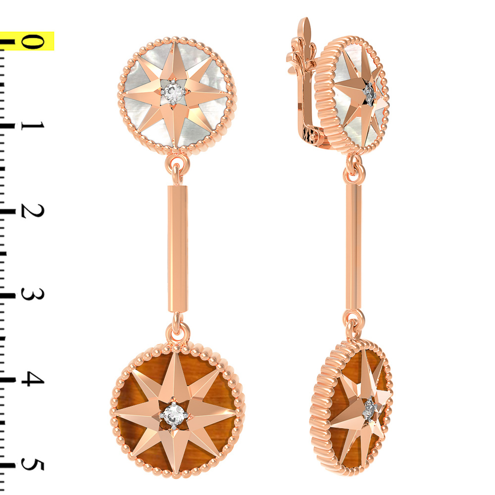 Серьги из золота c фианитом, тигровым глазом и перламутром