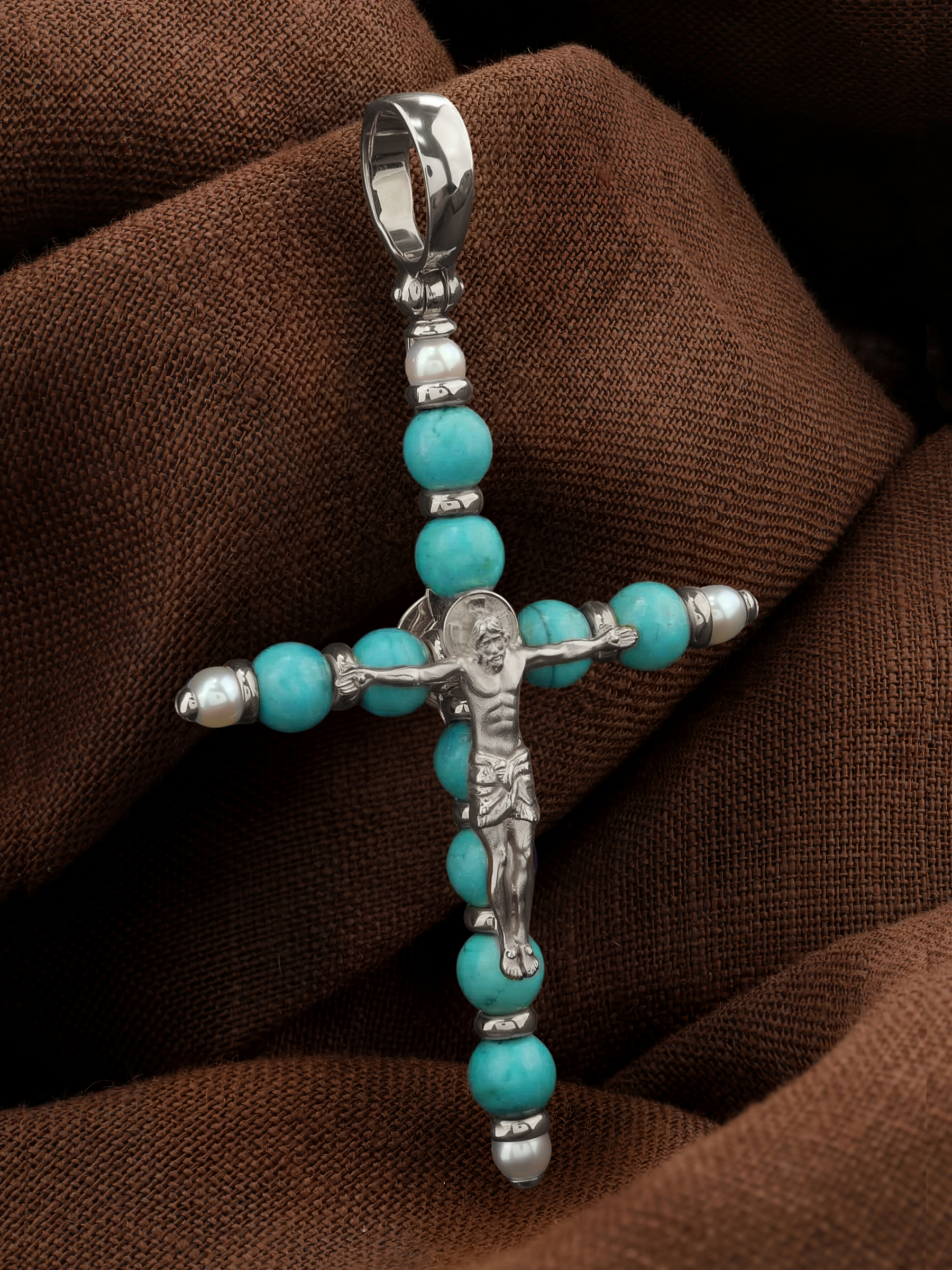 На лицевой стороне креста изображено Распятие Господа и Спасителя нашего Иисуса Христа. Своими крестными страданиями Господь смыл наши грехи, покрыл наш долг перед Богом или, на языке Писания, нас «искупил». В Голгофе сокрыта непостижимая тайна бесконечной правды и любви Бога. Крест стал символом победы добра над злом, жизни над смертью, напоминанием бесконечной Божьей любви, предметом радости. Воплотившийся Сын Божий Своею кровью освятил крест и сделал его проводником Своей благодати, источником освящения верующих. На верхней табличке, выше головы Иисуса, расположена надпись, составленная Понтием Пилатом — «IНЦI». Она означает «Иисус Назорей, Царь Иудейский». Надпись «IC» «ХC», означает Иисус Христос, помещаются на разных сторонах поперечной перекладины креста. Христос в Своей Божественной любви, над которой смерть не властна и которая, страдая, и не страдает в обычном смысле, простирает к людям со Креста Свои объятия, в которые призывается и привлекается весь мир. Поэтому Тело Его не висит, а торжественно покоится на Кресте.