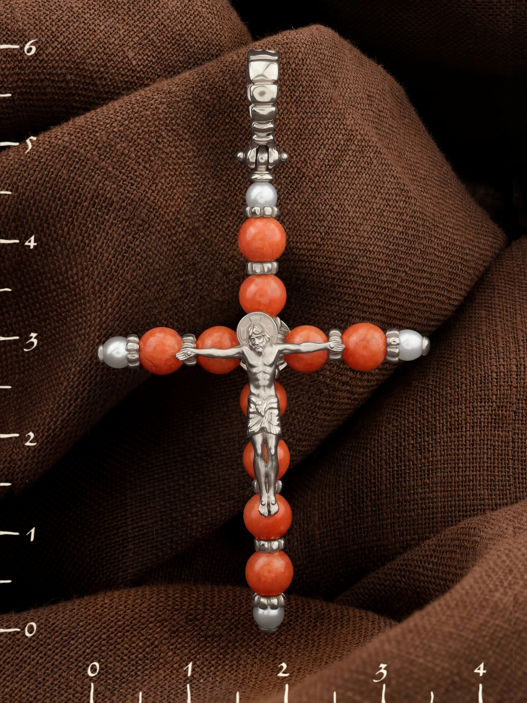 Крест из белого золота c жемчугом и кораллом