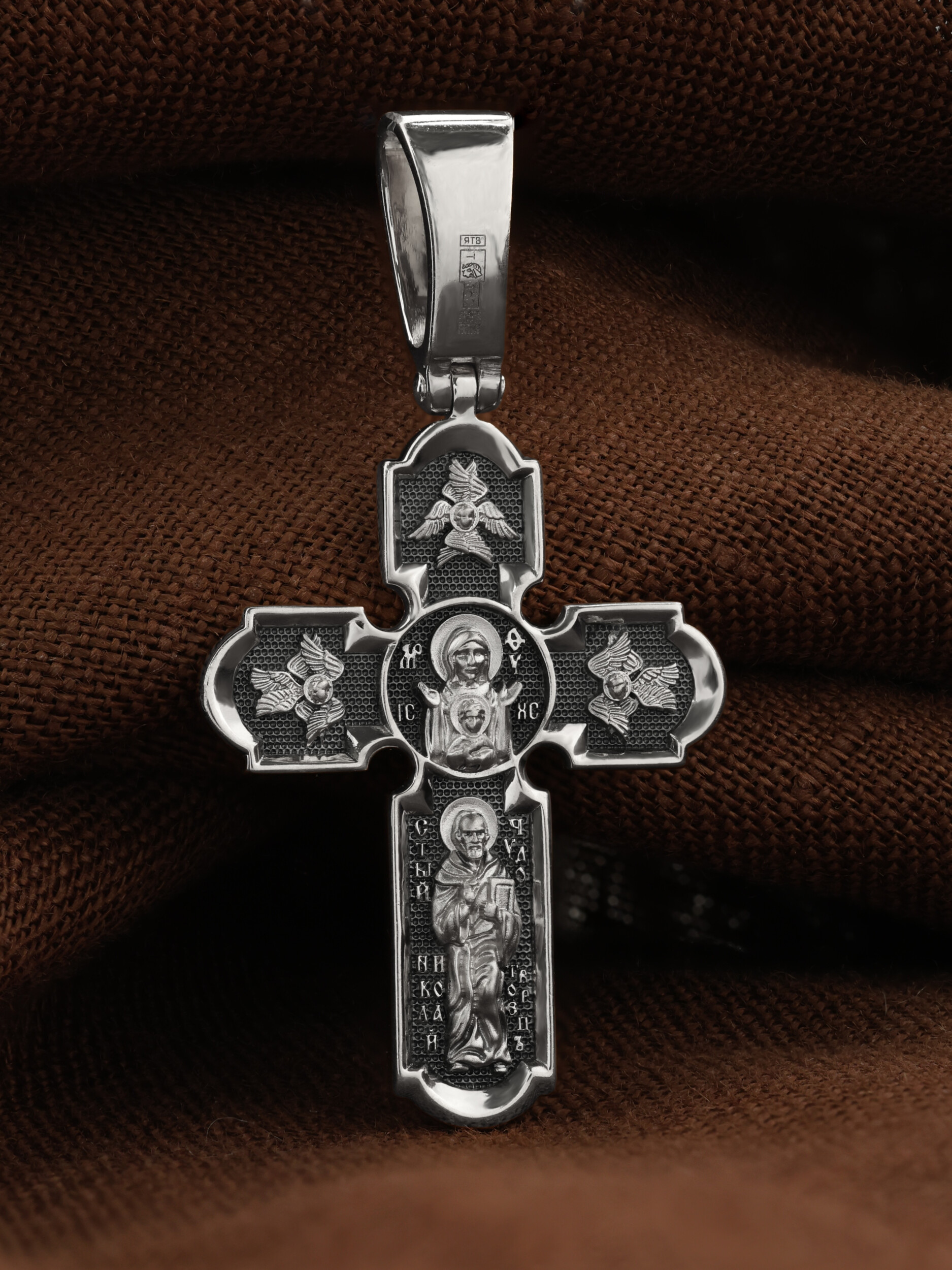 У основания креста в полный рост изображен самый любимый святой Православной Церкви — Николай Чудотворец. Святой почитается как целитель болезней, покровитель путешествующих, особенно по морю, помощник в торговле, учебе, а также в поисках достойного супруга.