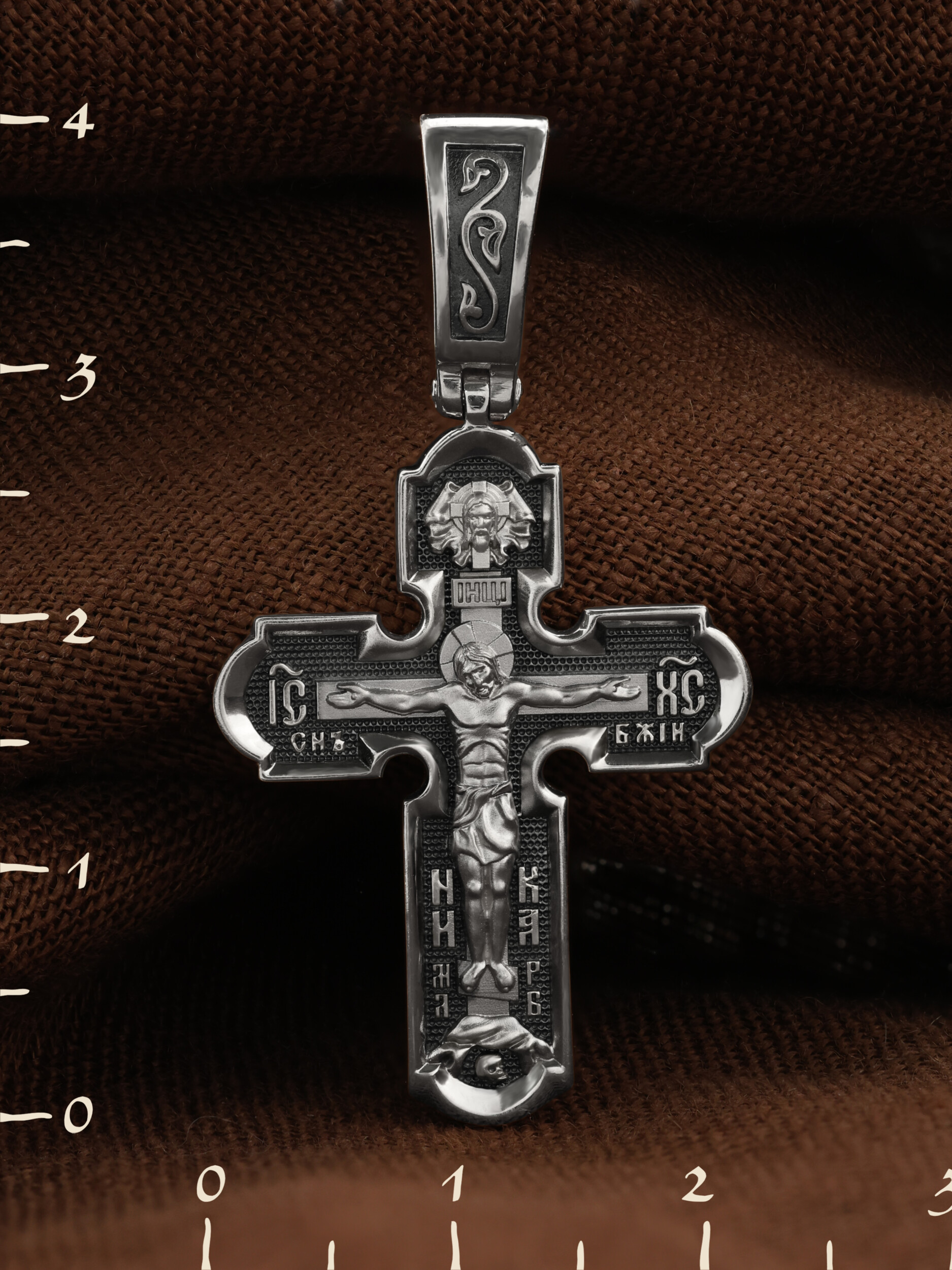 На лицевой стороне нательного креста по традиции изображено Распятие Господа нашего Иисуса Христа. Крест Господень стоит на небольшом каменистом возвышении, символизирующем гору Голгофу, которая обозначена буквами МЛРБ (Место Лобное Рай Бысть). Над головой Господа на поперечной перекладине написано «ИНЦИ», что символизирует табличку, которая была прибита к Кресту, с надписью «Иисус Назорей Царь Иудейский». Этим иудеи хотели посмеяться над Христом, не зная, что распинают истинного Царя всех царей. По сторонам основной перекладины расположены позолоченные рельефные инициалы Христа «ИС ХС». Под перекладиной, по сторонам древа, находится надпись «СЫН БОЖИЙ», а в основании креста — надпись «НИКА» (Победитель).