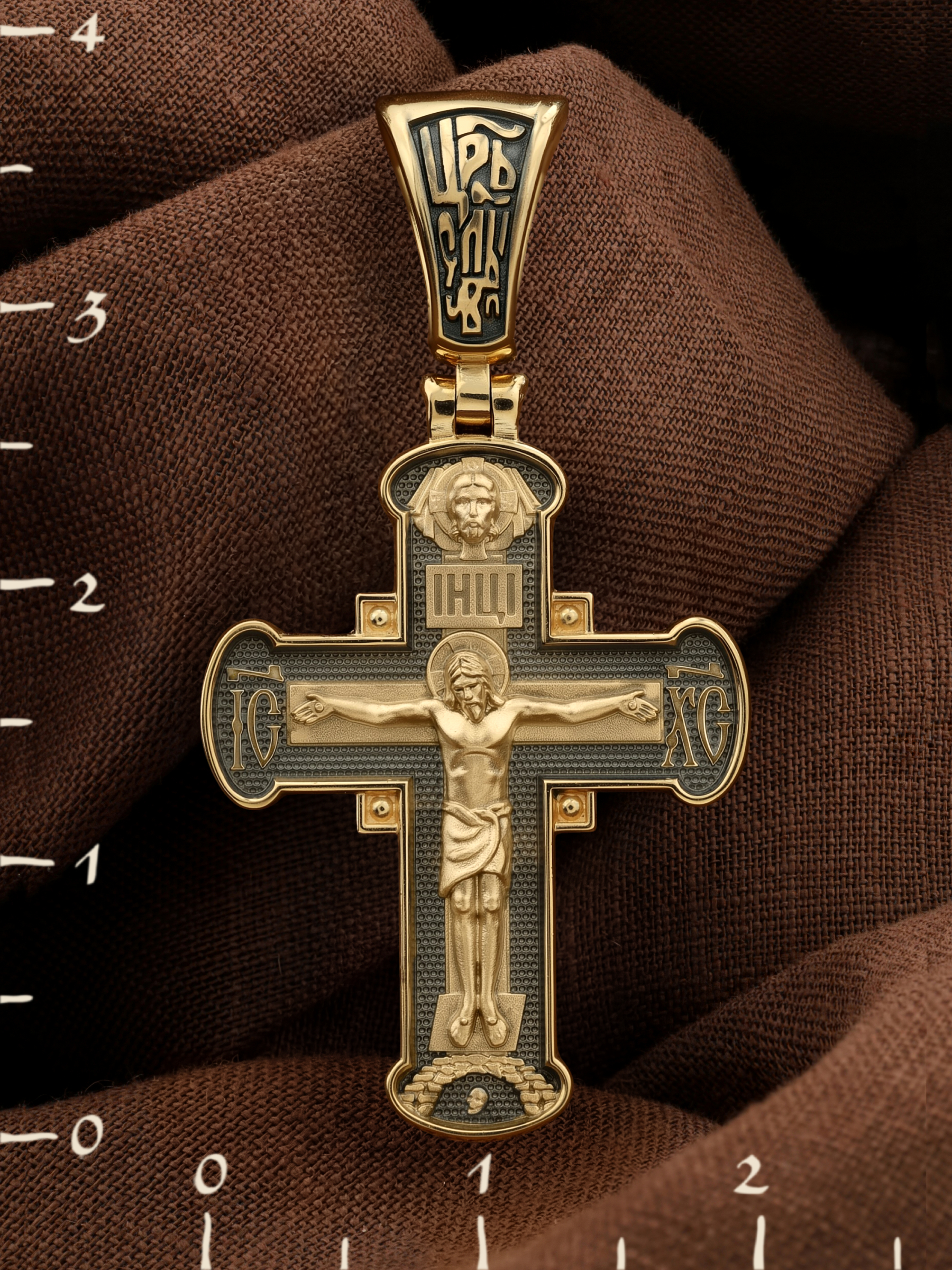 На лицевой стороне креста изображено Распятие Господа и Спасителя нашего Иисуса Христа, отдавшего Себя на смерть, для искупления грехов мира. Крест является символом жертвенной любви Всеблагого Бога к падшим людям, всепобеждающим духовным оружием христиан, основанием и средоточием церковной жизни. Господь сказал: «кто хочет идти за Мною, отвергнись себя, и возьми крест свой, и следуй за Мною». (Мк. 8: 34). На кулонном кольце помещена надпись «Царь Славы». На верхней табличке, выше головы Иисуса, расположена надпись, составленная Понтием Пилатом — «IНЦI». Она означает «Иисус Назорей, Царь Иудейский». Над ней — Нерукотворный образ Господа и Спасителя нашего Иисуса Христа, чудесно отпечатавшийся на плате, котором Христос вытер свой лик. Надпись «IC» «ХC», означает Иисус Христос, помещается на разных сторонах поперечной перекладины креста. Крест стоит на горе камней, символизирующих Голгофу. В ее основании различается череп– это голова Адама.