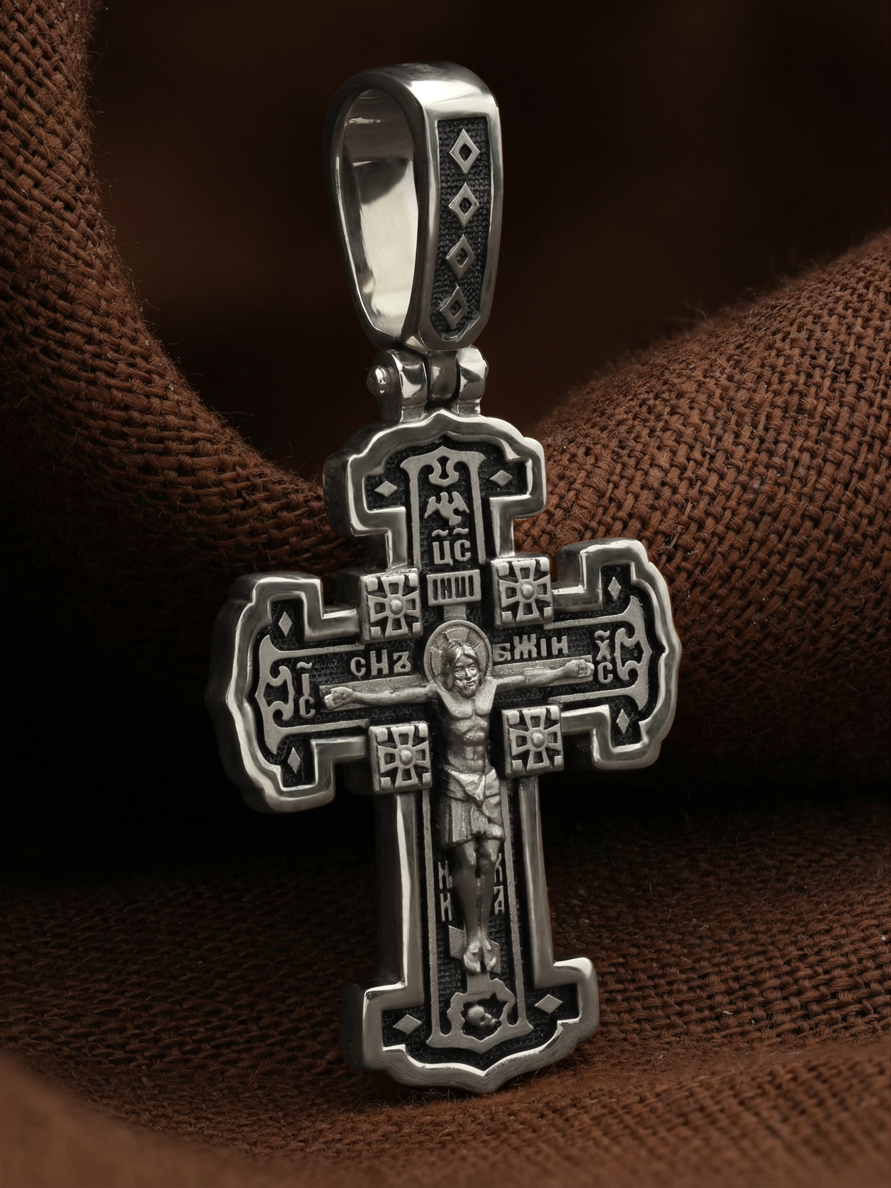 На лицевой стороне креста изображено Распятие Господа и Спасителя нашего Иисуса Христа. В Голгофе сокрыта непостижимая тайна бесконечной правды и любви Бога. Крест стал символом победы добра над злом, жизни над смертью, напоминанием бесконечной Божьей любви, предметом радости. Воплотившийся Сын Божий Своею кровью освятил крест и сделал его проводником Своей благодати, источником освящения верующих. Над вершиной Распятия помещена надпись «Царь Славы» и изображение Духа Святого в виде голубя, сходящего с небес. Надпись «IС» « ХС» означает Иисус Христос и помещается на разных сторонах поперечной перекладины креста. Рядом расположена надпись «Сын Божий». Слово «НИКА», что означает «победитель», помещаются в нижней части креста. Крест стоит на горе камней, символизирующих Голгофу. В ее основании различается череп — это голова Адама. На православном кресте Христос не умирает, а свободно простирает руки, ладони Иисуса открыты, будто он хочет обнять все человечество, даря им свою любовь и открывая путь к вечной жизни.