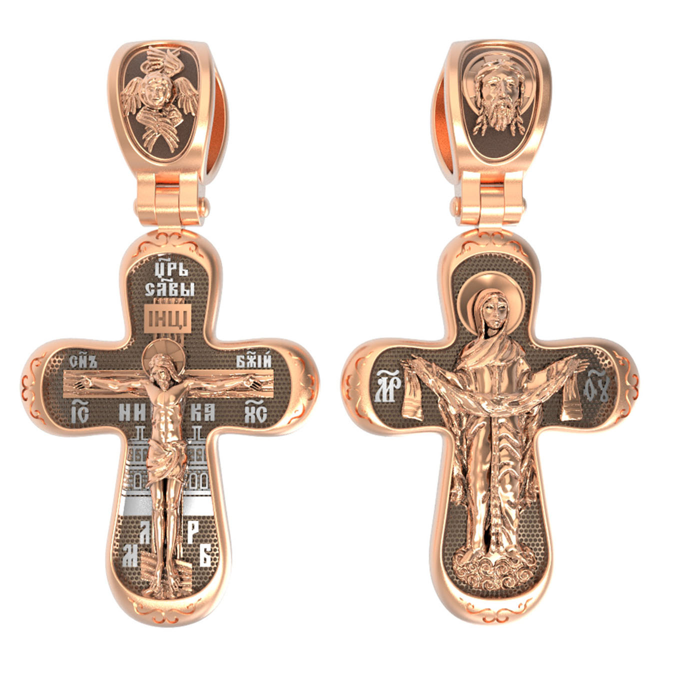 На обороте креста изображена икона Покрова Пресвятой Богородицы. Праздник Покрова Божией Матери является воспоминанием чуда, которое произошло во Влахнернской церкви 1 (14) октября 910 года: Пресвятая Богородица явилась верующим над алтарем храма и распростерла над ними Свое покрывало. В этот день Божья Матерь открыла людям, что Она является Ходатаицей за них перед Богом. Богородица простирает Свой молитвенный покров над всеми православными христианами и умоляет Сына Своего о даровании вечного спасения каждому человеку. На кулонном кольце изображен Спас Нерукотворный — Символ вочеловечившегося Божества и шестикрылый Серафим — самый приближенный к Господу Ангел.