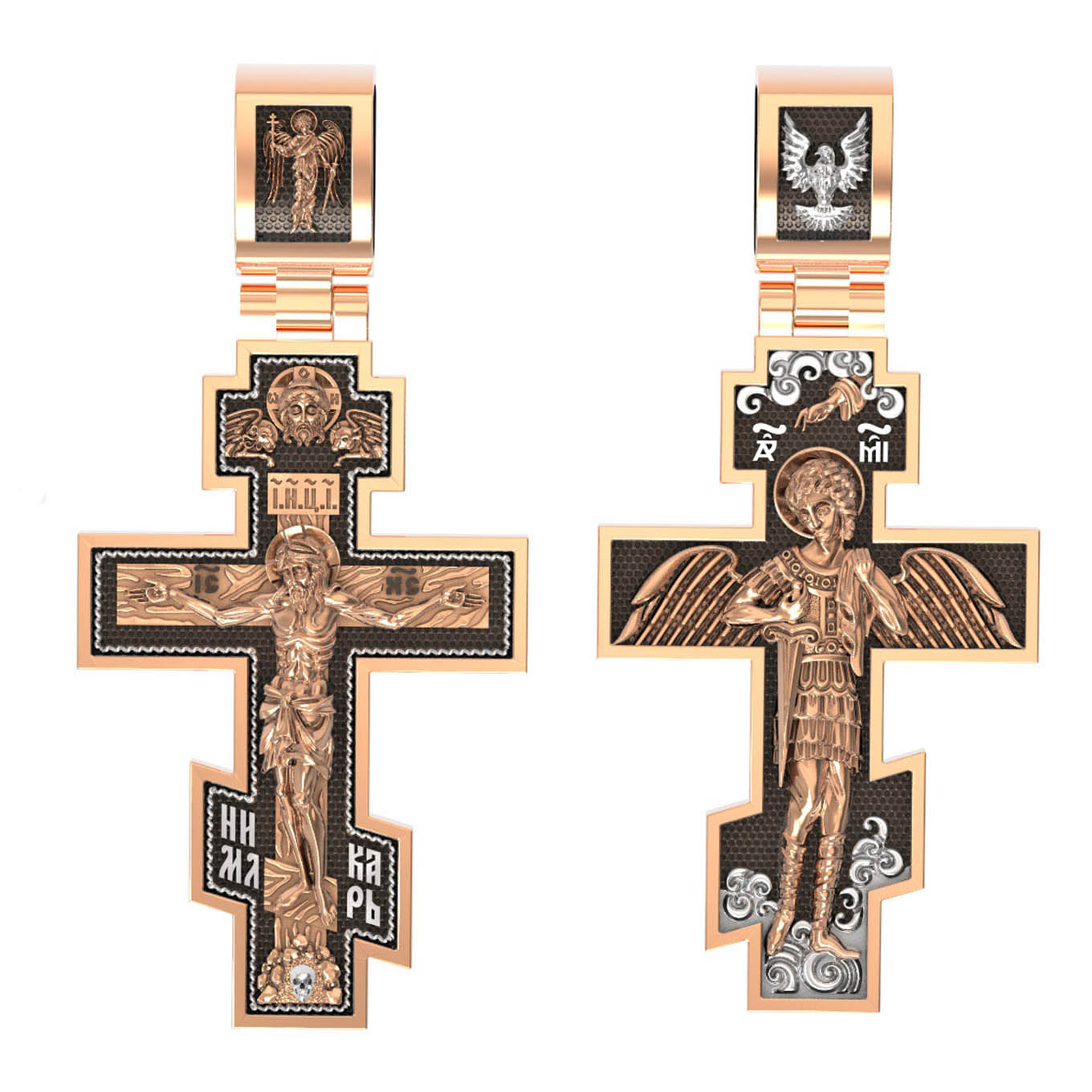 На оборотной стороне креста помещен Архангел Михаил, самый могущественный из ангелов. Это он низверг дьявола и встал во главе ангелов для борьбы с бесовскими силами. Его имя означает «Кто яко Бог?», так как он самый могучий и грозный враг зла. Древнерусские князья и воины стремились обрести покровительство Небесного Воеводы и нередко украшали свои шлемы его крылатой фигурой. На Руси также верили, что Архангел Михаил, как непримиримый враг дьявола, защищает и души умерших от бесовских нападений, провожая их на Небеса. Поэтому ему часто посвящались кладбищенские церкви.