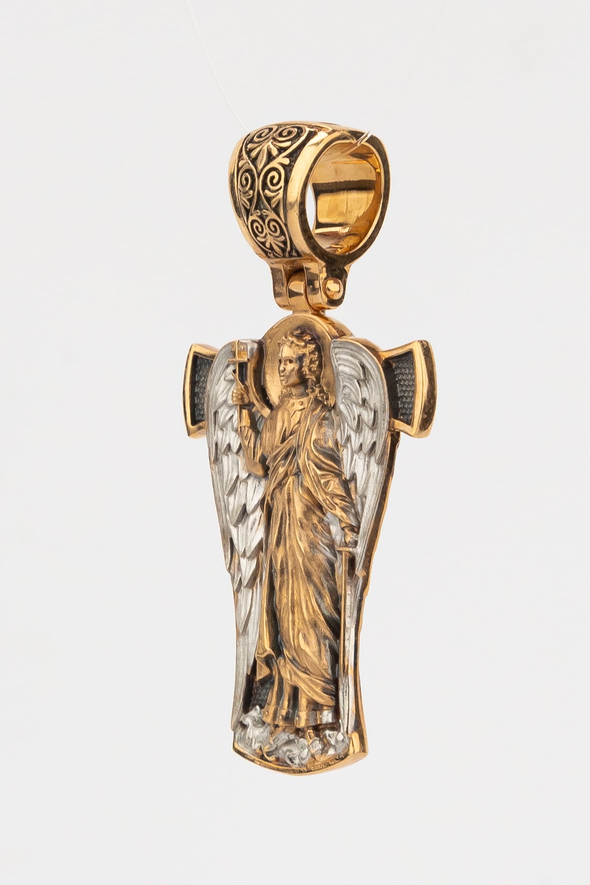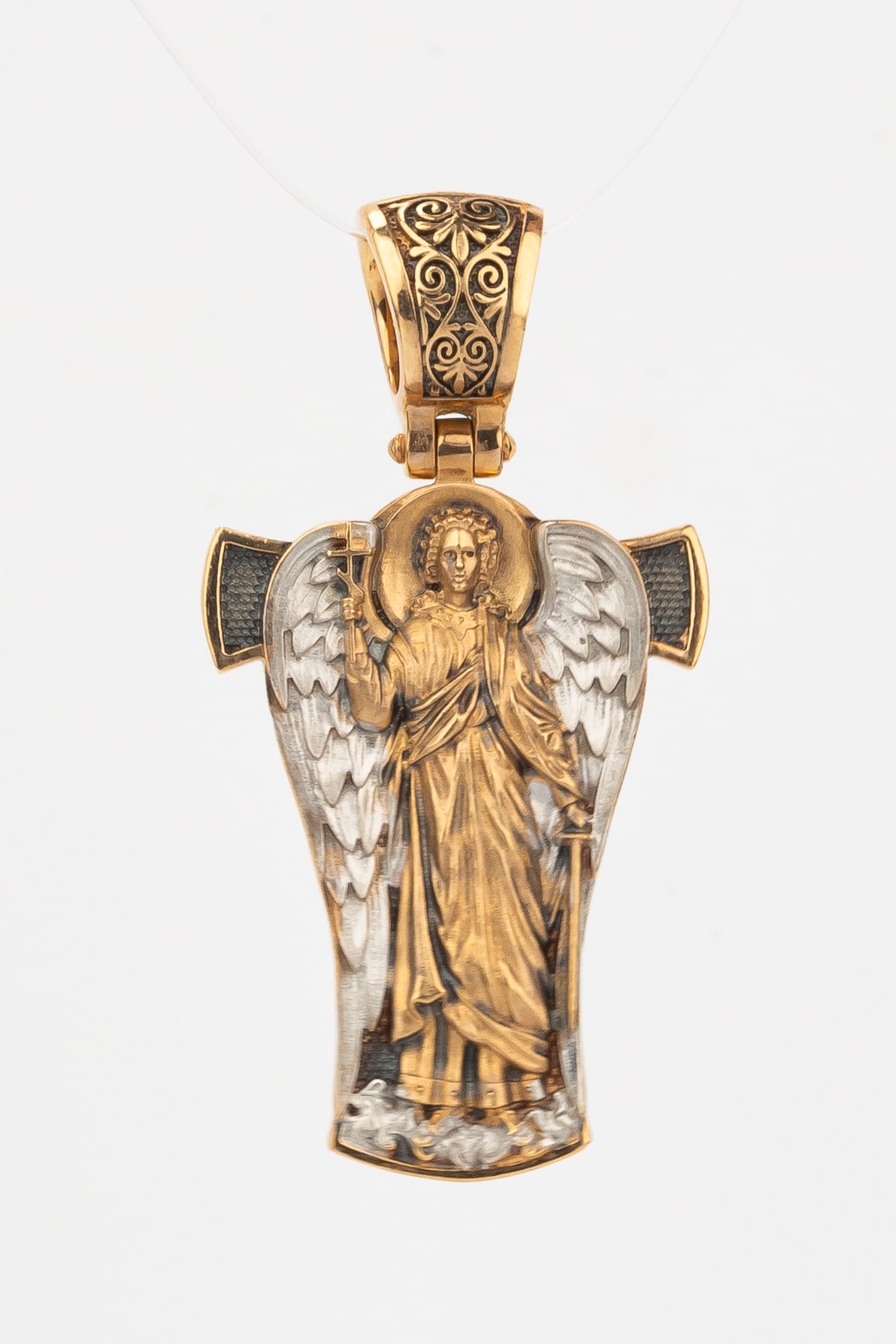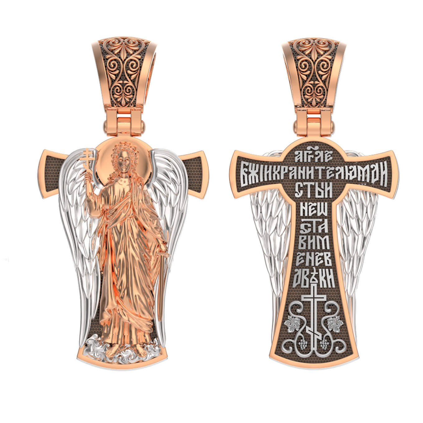 Основой композиции является изображение Святого Ангела-Хранителя держащего в правой руке крест, а в левой — мечь. Крест является символом жертвенной любви всеблагого Бога к падшим людям, всепобеждающим духовным оружием христиан, основанием и средоточием церковной жизни. Господь сказал: «кто хочет идти за Мною, отвергнись себя, и возьми крест свой, и следуй за Мною». (Мк. 8: 34). Ангел-Хранитель — это Ангел приставляемый Богом к человеку при крещении для охраны и помощи в добрых делах. Он невидимо находится при человеке на протяжении всей его жизни, если человек сохраняет в себе любовь к Богу и истинную веру перед Ним. Ангел-Xранитель делают для нас все, что служит к истинному нашему благу и спасению. Невидимо пребывая при нас постоянно, он, руководствуя нас ко спасению, не только по нашему желанию таинственно наставляет нас на все доброе и полезное, не только возносит наши молитвы к Богу, но еще и сам от себя охраняют и защищают нас от врагов видимых и невидимых и ходатайствует за нас пред Богом. Ангел-Хранитель так любит нас, как никто на земле любить не может. Одного лишь каждому из нас он желает — спасения души; к этому он направляет все свои заботы. И если видит нас также заботящимися о спасении, радуется, если же видит нас пребывающими в нерадении о душе своей, скорбит. Но и самый великий грешник может примириться со своим Ангелом-Хранителем посредством искреннего раскаяния в грехах и оставления их навсегда. В таком случае, по слову Писания, великая радость бывает для всех ангелов на небесах (Лк. 15:10).