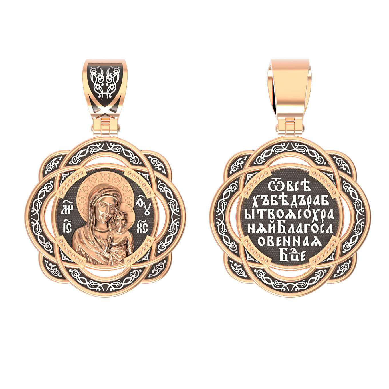 На лицевой части образка изображена Казанская икона Пресвятой Богородицы — одна из самых почитаемых в России. Икона была явлена на пожарище в Казани в 1579 году. В 1904 году святыня была похищена и уничтожена, но чудотворную силу иконы Богородица явила во многих ее списках. Молитва перед Казанской иконой Божьей Матери помогает во всех сложных случаях жизни, во всех печалях, невзгодах, скорбях.