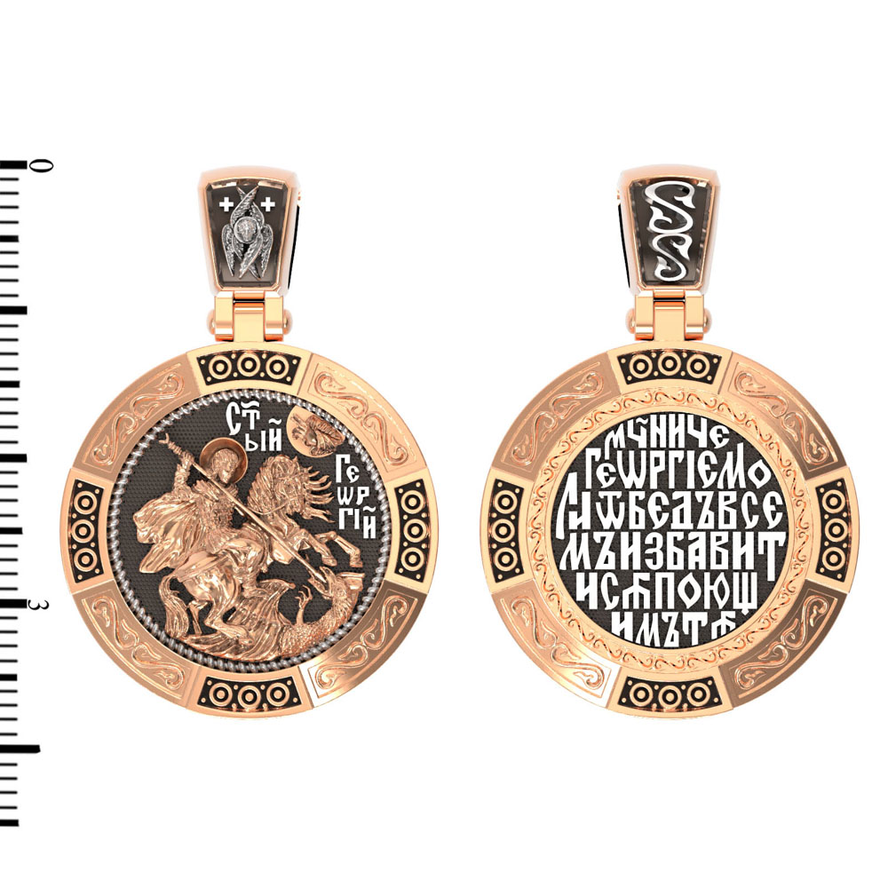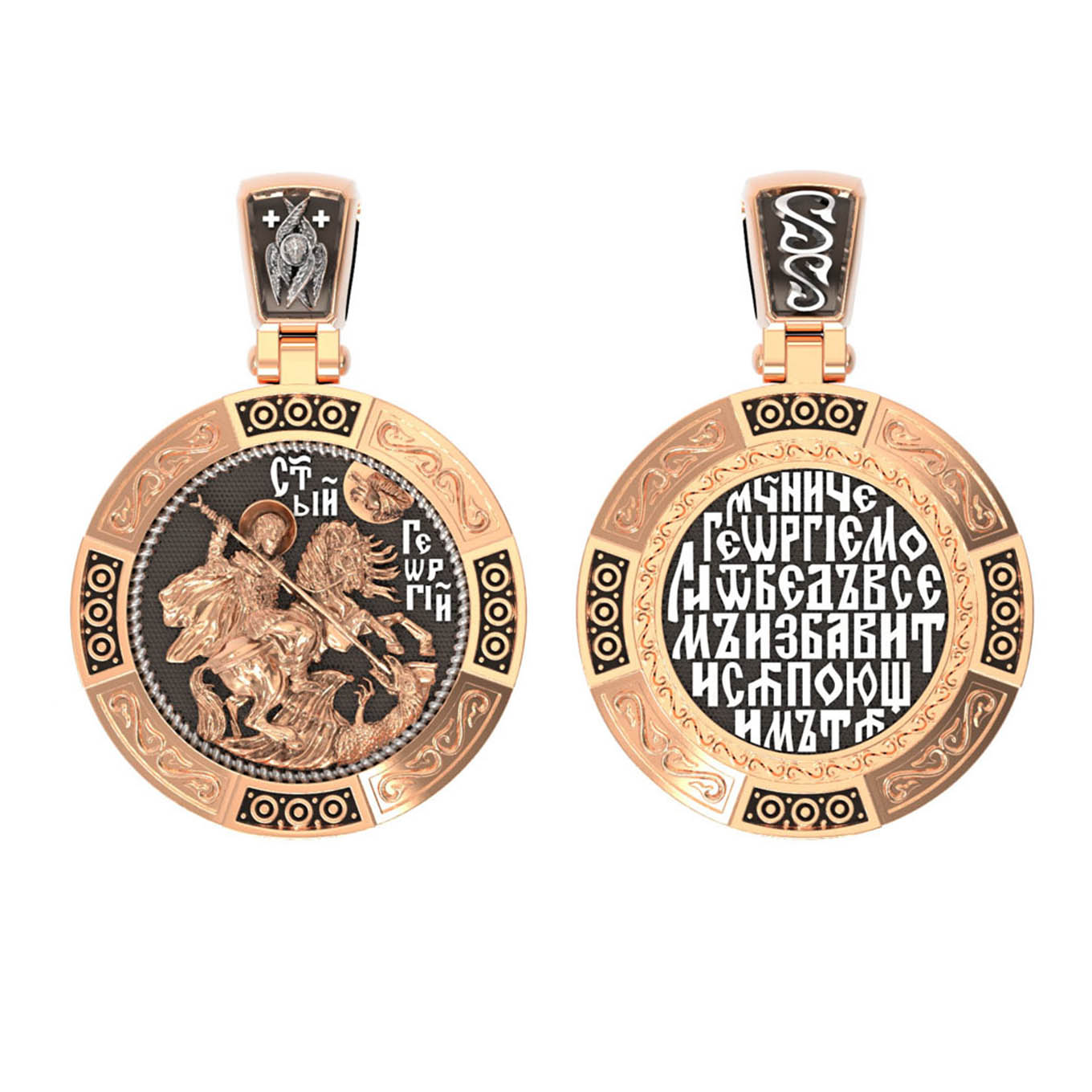 На лицевой стороне изображен Святой Георгий Победоносец. Образ Великомученика считают одним из наиболее чтимых святынь в Святыни Православных, он олицетворяет собой заступника для верующих, чья жизнь имеет какое-либо отношение к военным делам, также он может оберегать и землевладельцев. Одно из самых великих чудес, которое сотворил Великомученик — это спасения всего города от устрашающего змия. Молитвами и своей непреклонной верой, взываемой к Всевышнему, он смог одолеть чудовище. Святой убил змея, спас жителей и их души от влияния дьявола, породив в них надежду и веру в Господа, призывая людей принять христианскую веру. Поскольку при жизни св. Георгий был военным, он считается покровителем всех, кто имеет отношение к армии — военнослужащим, участникам боевых действий. Молитва перед иконой Георгия Победоносца поможет защититься от врагов, одержать победу в сражении (военном, спортивном, духовной брани с дьяволом), содействие в установлении мира между членами семьи, избавиться от телесного недуга. На кулонном кольце изображен шестикрылый Серафим — самый приближенный к Господу Ангел.