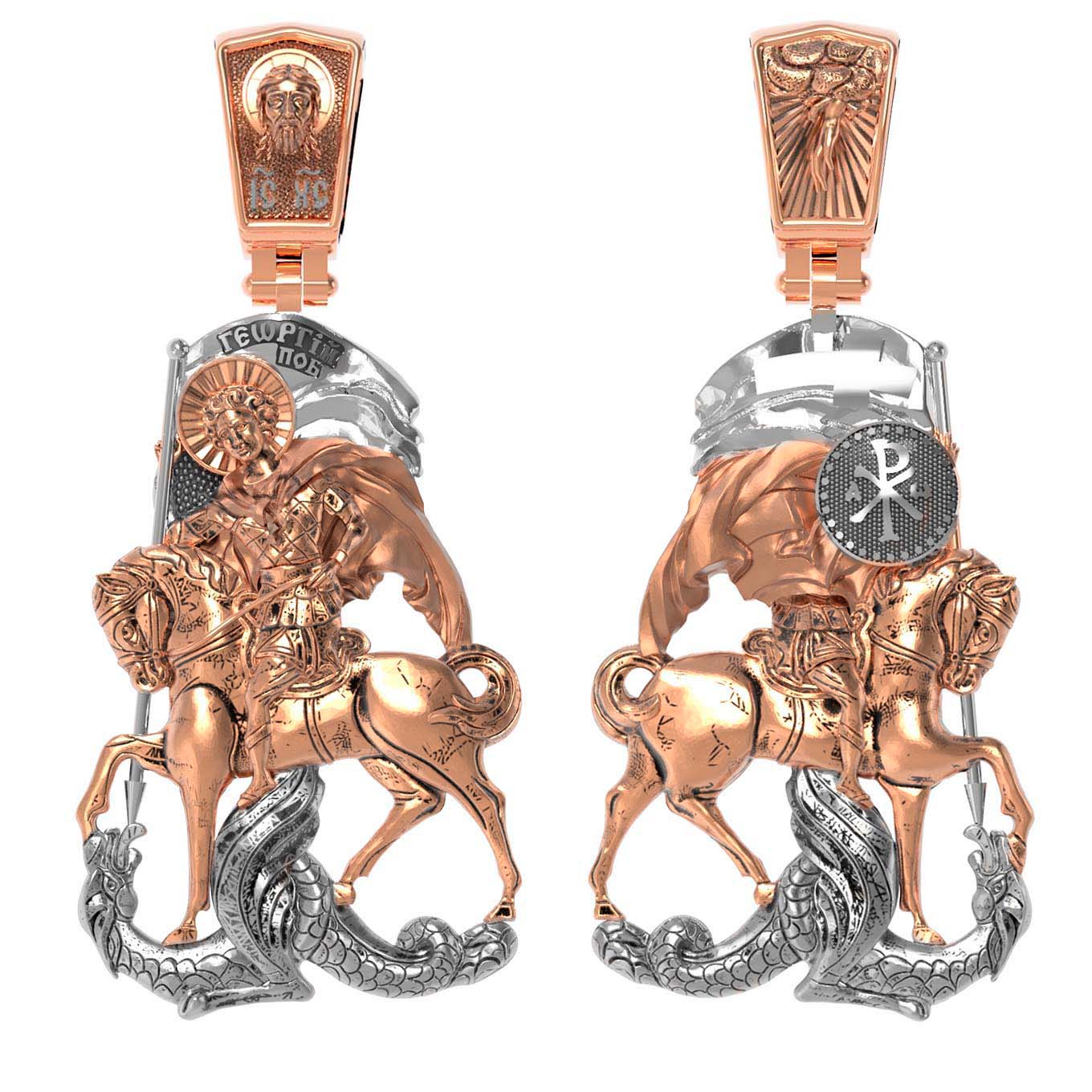 Основой композиции образка является изображение Святого Великомученика Георгия Победоносца — одного из самых почитаемых и удивительных святых. Георгий родился в Каппадокии (Малая Азия) в семье богатых и знатных горожан. Юношей поступил на службу к римскому императору Диоклетиану, за отличное знание военного дела и проявленную в боях и походах храбрость был приближен к императору и удостоен высокого воинского звания. Во время начавшихся гонений на христиан, перешел на сторону гонимых и, отвергнув человеческий страх, стал ярым проповедником учения Христа. Мучители подвергли опального воеводу жесточайшим восьмидневным пыткам и казнили его (обезглавили) в возрасте около тридцати лет в 303 году. На Руси он известен как Юрий или Егорий, заступник для верующих, чья жизнь имеет какое-либо отношение к военным делам, помощник в крестьянском труде. Образок сделан в виде воинского щита. На нем Георгий изображен как воитель, сидящий на вздыбленном коне и поражающий копьем огнедышащего змея. Справа над образом изображена благословляющая Божия десница. Змей символизирует собою сатанинские силы. Молитвами вознесенными к Всевышнему и своей непреклонной верой он смог одолеть чудовище. Святой убил змея, спас царскую дочь, принесенную в жертву, и жителей города, их души от влияния дьявола, породив в них надежду и веру в Господа, призывая людей принять христианскую веру. На оборотной стороне образка написана молитва: «Мучениче Георгие, моли Бога о мне».