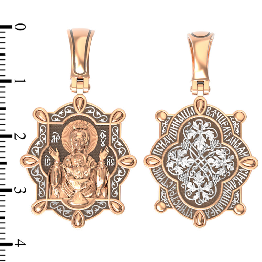 На лицевой части образка изображена икона Божией Матери «Неупиваемая чаша». Икона славится помощью в исцелении зависимостей, помогает людям обрести свободу от греховных страстей.