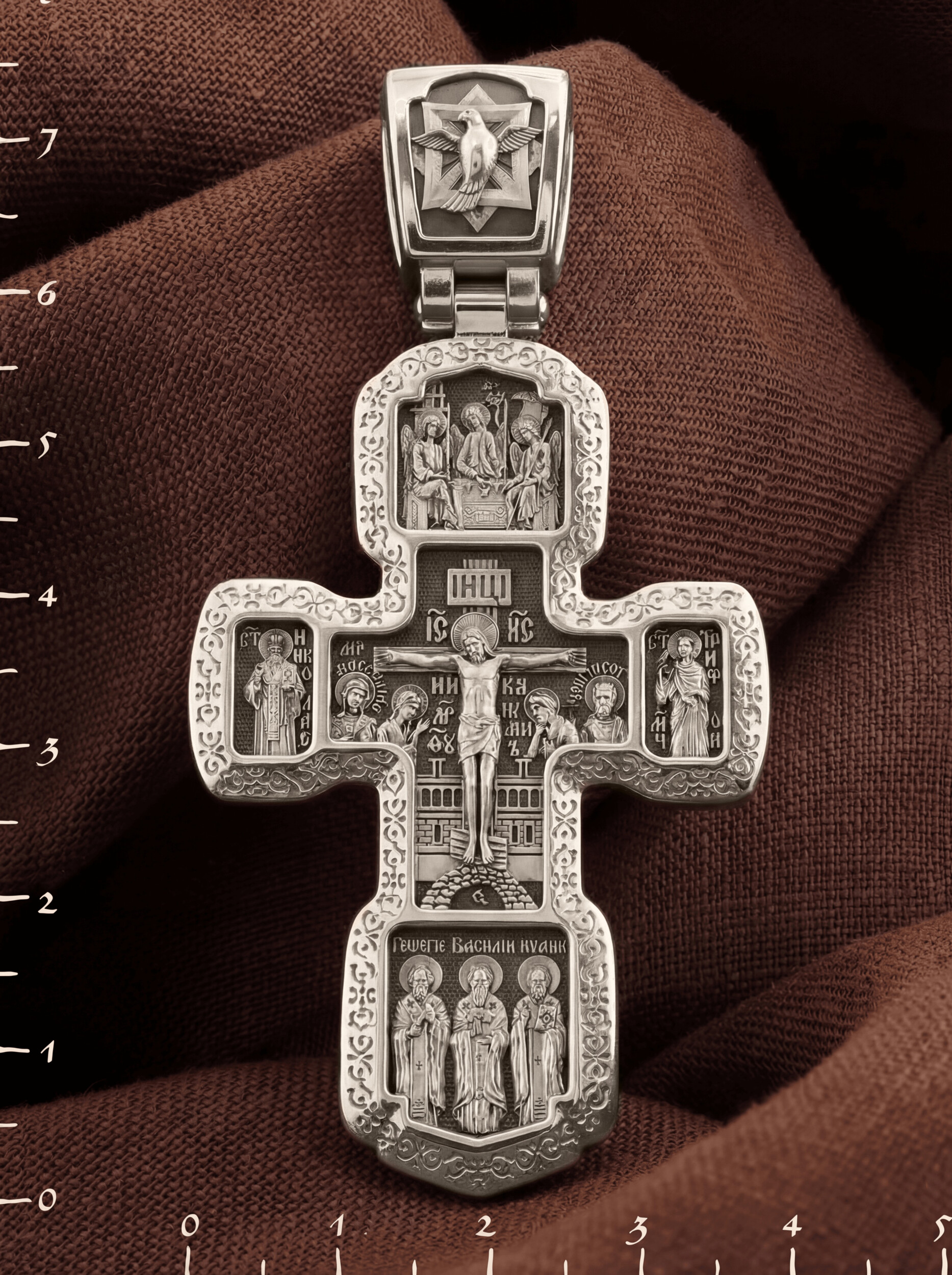 Центральную часть лицевой стороны занимает Распятие Господа Иисуса Христа с предстоящими Ему святыми, которые, по преданию, находились у Креста Господа во время Его казни. Слева — Пресвятая Богородица и жены-мироносицы — равноапостольная Мария Магдалина и святая Мария Клеопова, справа — праведный Иосиф Аримофейский и мученик Лонгин Сотник. Над Распятием помещена икона Святой Троицы. Ангелы сидят за трапезным столом вокруг чаши, которая символизирует грядущую жертву Второго Лица Пресвятой Троицы, Бога Сына. Слева от Господа находится святой Николая Чудотворец, справа — святой мученик.