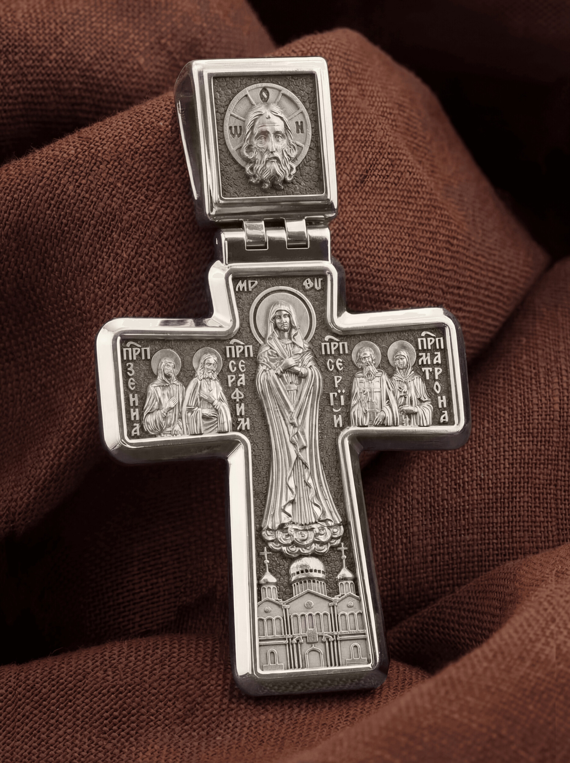 На лицевой стороне креста изображено Распятие Иисуса Христа. Позади Его изображена иерусалимская стена, знак того, что Господь был распят вне стен города. Но вместе с тем стена знаменует и Небесный Иерусалим, путь в который открылся для человечества через Голгофу: «МЛРБ», «Место Лобное Рай Бысть» — написано у ее основания. Рядом с Его образом помещены слова «Царь Славы». Эти слова характеризуют Господа как Великого Архиерея, победителя смерти. Верхняя перекладина символизирует титло — табличку, на которой, согласно Евангелию, было начертано: «Иисус Назорей Царь Иудейский» (IНЦI). Также Распятие сопровождается надписями, олицетворяющими Христа. Это святое имя Христа «IC» (Иисус) «ХС» (Христос), и словосочетание «Сын Божий», а так же написан тропарь Животворящему Кресту: «Кресту Твоему поклоняемся, Владыко, и святое воскресение Твое славим». Распятие стоит на горе камней, символизирующих Голгофу, в основании которой различается череп. Это голова Адама. На кулонном кольце помещено изображение Святой Троицы.
