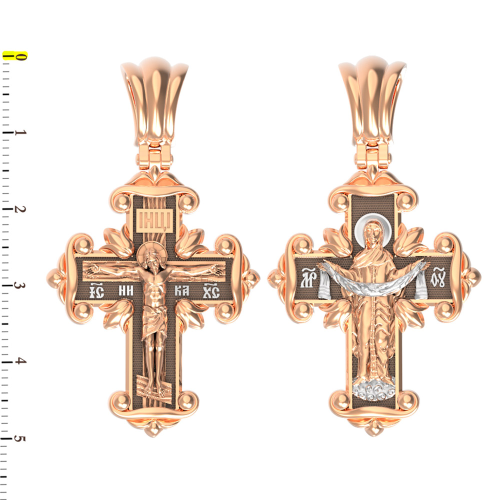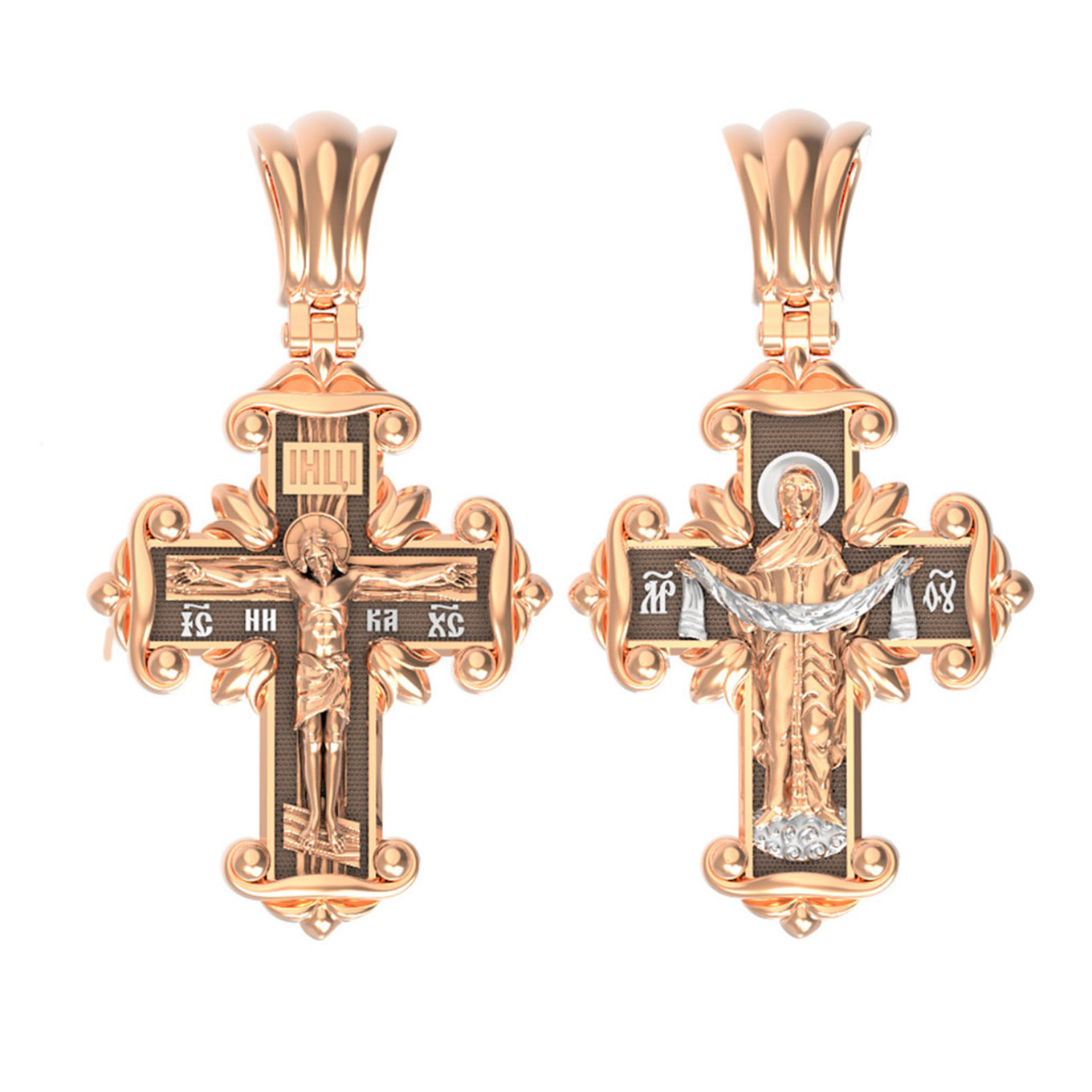На оборотной стороне креста изображена икона Божией Матери «Покров Пресвятой Богородицы». Праздник Покрова Пресвятой Богородицы пришел на Русь в XII веке из Византии и стал одним из самых почитаемых. В 910 году Византийской Империи угрожали нападением сарацины. Не видя ниоткуда помощи, в те дни греки во множестве стекались в Константинополь, во Влахернский храм, в котором хранились риза Богоматери и Ее головной покров, и молились. 1 (14) октября 910 года Святому Андрею Юродивому и его ученику Епифанию было видение Покрова Божией Матери. Пресвятая Богородица, в окружении Святых, явилась над алтарем Храма и слезно молилась. По окончании молитвы сняла с Себя блистающее великое и страшное покрывало, которое носила на Пречистой главе Своей и, держа его с великой торжественностью, распростерла над всем стоящим народом. Вскоре враги без всякого кровопролития отступили от города. Богородица простирает Свой молитвенный покров над всеми православными христианами и умоляет Сына своего о даровании вечного спасения каждому человеку.