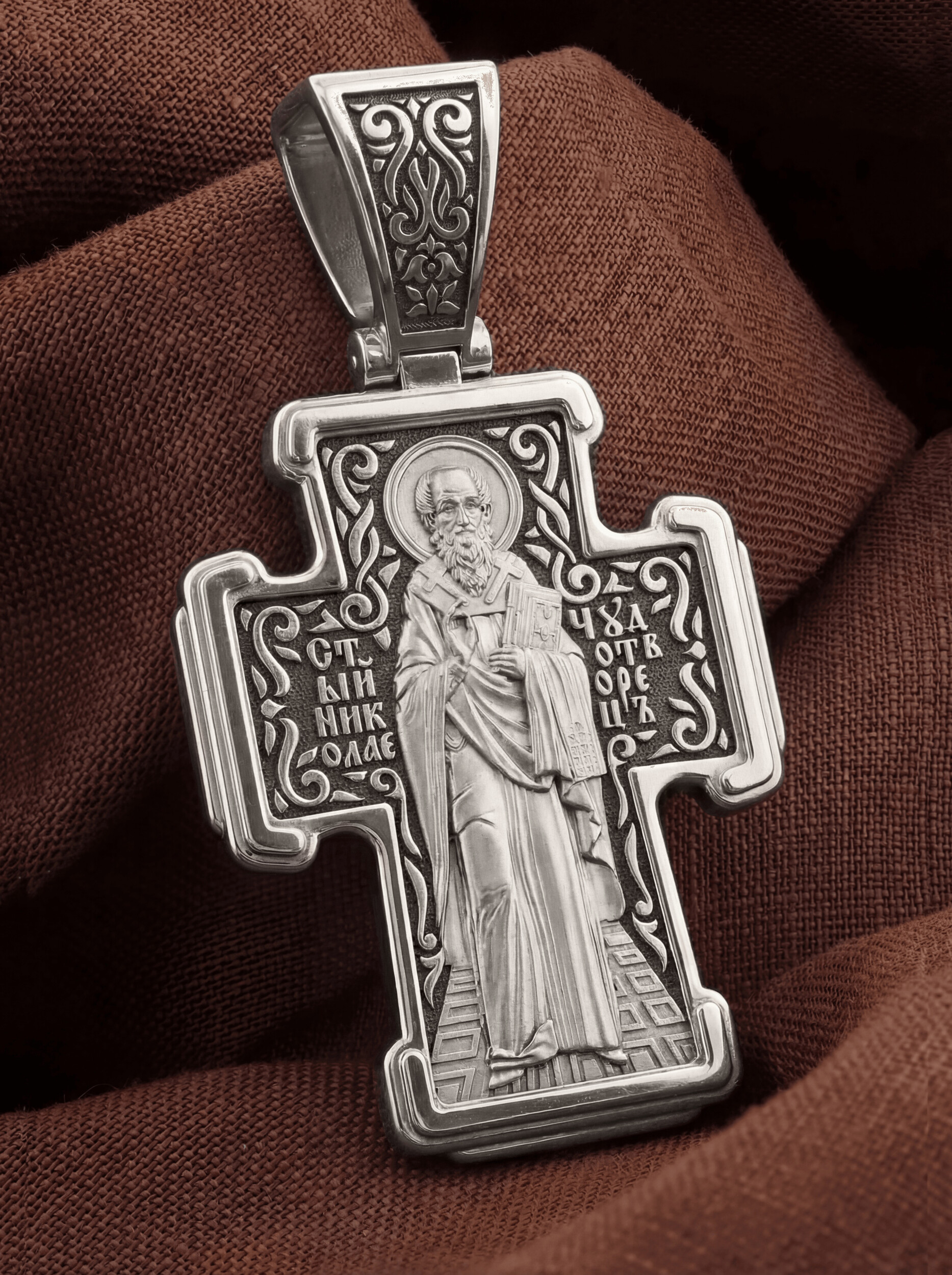 На оборотной стороне креста изображен Святитель Николай архиепископ Мир Ликийских, Чудотворец. Он является одним из самых почитаемых святых в православном мире. Святитель Николай родился во второй половине III века в Малой Азии в Ликийском городе Патары. С рождения Божий Угодник проявлял необыкновенные дарования. Сохранилось Предание, что во время крещения он, никем не поддерживаемый, простоял в купели три часа. Вся жизнь святого Николая — это служение Богу. Много великих и преславных чудес сотворил на земле и на море великий Святитель Николай Угодник. Он помогал сущим в бедах, укрощал штормы, спасал от потопления и выносил на сушу из глубины морской, освобождал из плена и приносил освобожденных домой, избавлял от уз и темницы, защищал от посечения мечом, освобождал от смерти и подавал многим различные исцеления, слепым прозрение, хромым хождение, глухим слух, немым дар слова.