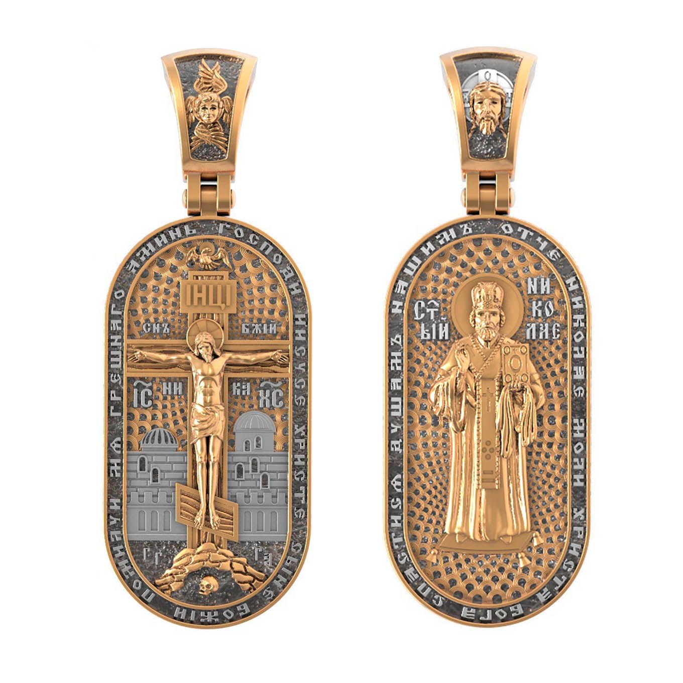 На оборотной стороне изображен Святой Николай Чудотворец, которого еще называют Николай Угодник — помощник в делах, покровитель учащихся, утешитель обиженных и нуждающихся, целитель самых страшных и тяжелых недугов, предстатель и молитвенник за людей перед Богом. Также Святитель Николай Чудотворец известен своими молитвами за путешественников, когда непрестанный ветер и бушующие волны утихают и корабль заходит в спокойную гавань. По контуру написана молитва: «Отче, Николай, моли Христа Бога спастися душам нашим». На кулонном кольце помещено изображение Спаса Нерукотворного.