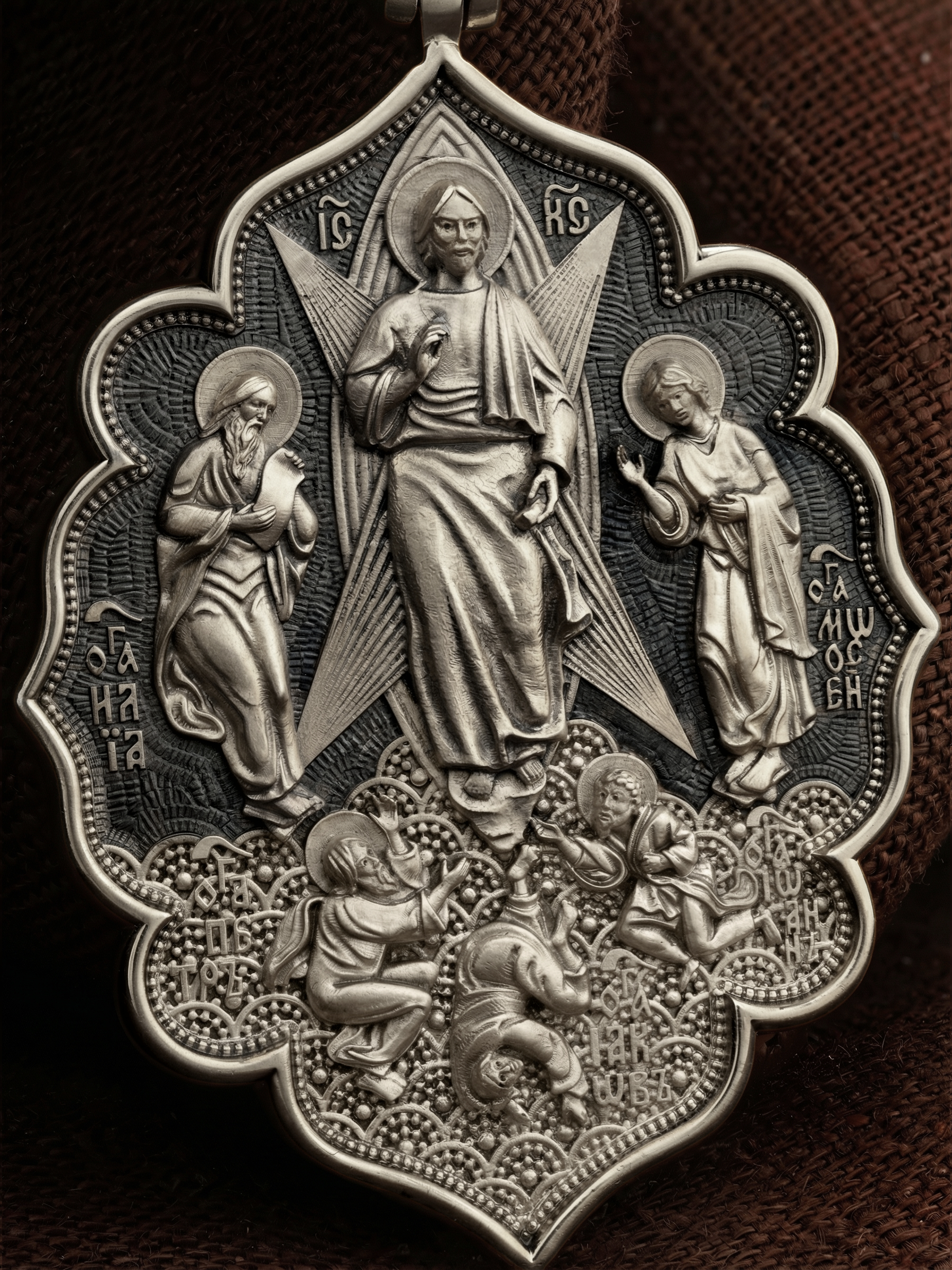 На лицевой стороне образка изображена икона «Преображения Господня». Преображение — одно из немногих Евангельских событий, которое по канону можно изображать не только там, где оно реально происходило. Преображение Господне на иконах можно увидеть на фоне посвященных ему монастырей и храмов. Это объясняется тем, что каждый христианский храм является духовным Фавором, где в церковных таинствах и молитве душа верующих приближается к своему преображению. Образ являет Господа Иисуса Христа в тот момент, когда Он предстал трем Своим ученикам: Петру, Иакову и Иоанну Богослову. Пророки Моисей и Илия предстояли рядом и беседовали с Ним. Апостолы едва могли вынести бесконечную радость, которая охватила их в присутствии Бога. Когда же на гору спустилось облако и раздался глас Божий: «Сей есть Сын Мой Возлюбленный; Его слушайте», апостолы в сильном страхе пали на землю (Лк. 9:35). На иконах «Преображение Господне» они так и изображаются — лежащими у ног Христа. Во главе образка изображен парящий голубь — символ Святого Духа и Его благодати.
