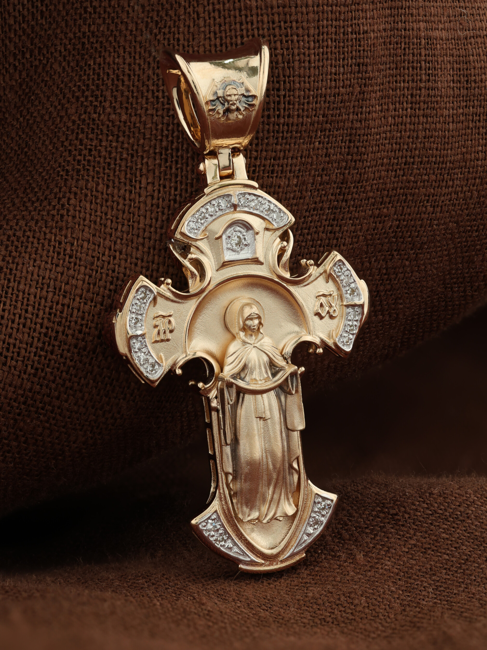 На оборотной стороне креста размещен образ Божией Матери «Покров Пресвятой Богородицы». Праздник Покрова Пресвятой Богородицы пришел на Русь в XII веке из Византии и стал одним из самых почитаемых. В 910 году Византийской Империи угрожали нападением сарацины. Не видя ниоткуда помощи, в те дни греки во множестве стекались в Константинополь, во Влахернский храм, в котором хранились риза Богоматери и Ее головной покров, и молились. 1 (14) октября 910 года Святому Андрею Юродивому и его ученику Епифанию было видение Покрова Божией Матери. Пресвятая Богородица, в окружении Святых, явилась над алтарем Храма и слезно молилась. По окончании молитвы сняла с Себя блистающее великое и страшное покрывало, которое носила на Пречистой главе Своей и, держа его с великой торжественностью, распростерла над всем стоящим народом. Вскоре враги без всякого кровопролития отступили от города. Богородица простирает Свой молитвенный покров над всеми православными христианами и умоляет Сына своего о даровании вечного спасения каждому человеку. На кулонном кольце размещен образ Спас Нерукотворный — образ Господа и Спасителя нашего Иисуса Христа, чудесно отпечатавшийся на плате, котором Христос вытер свой лик.