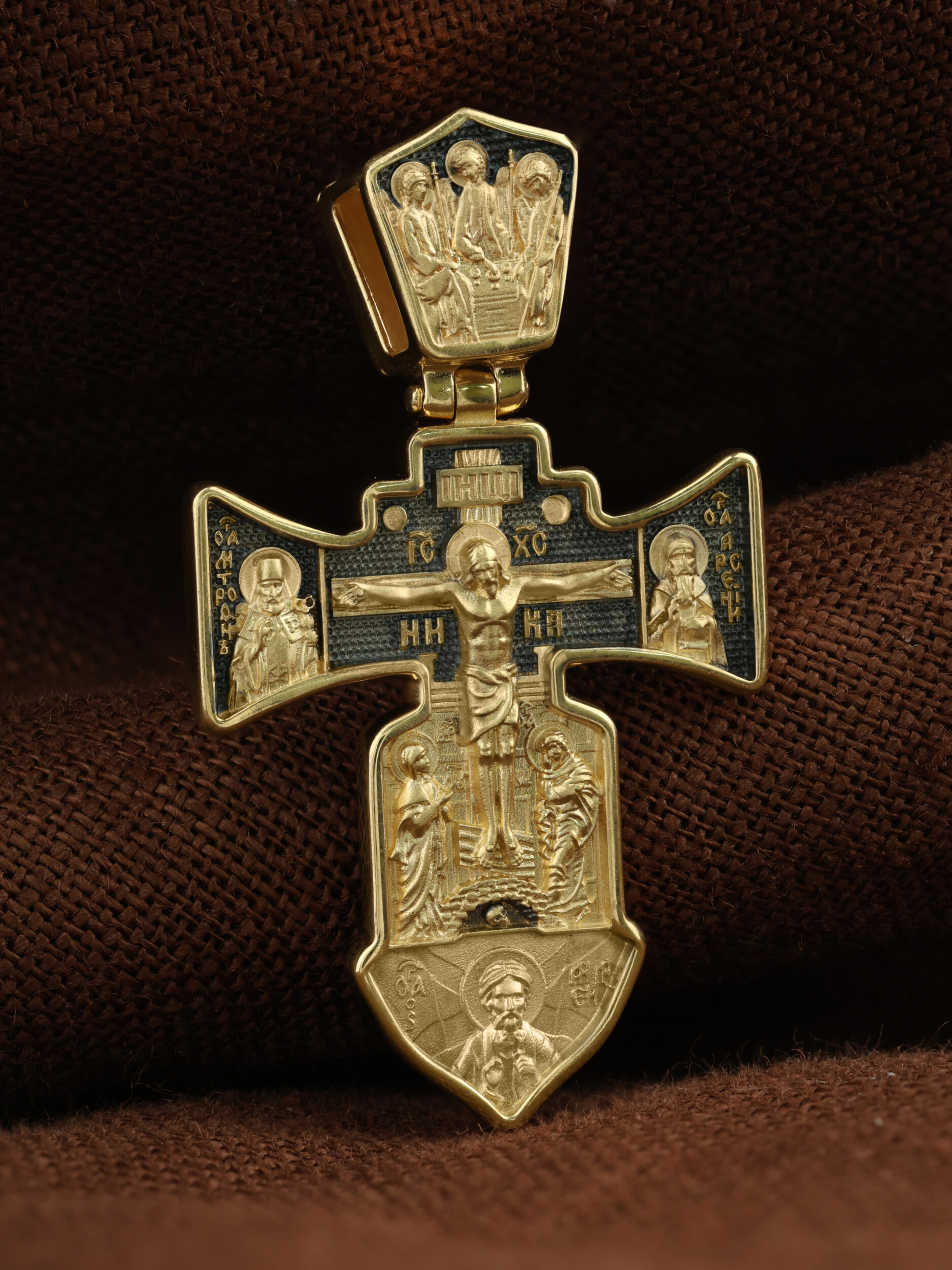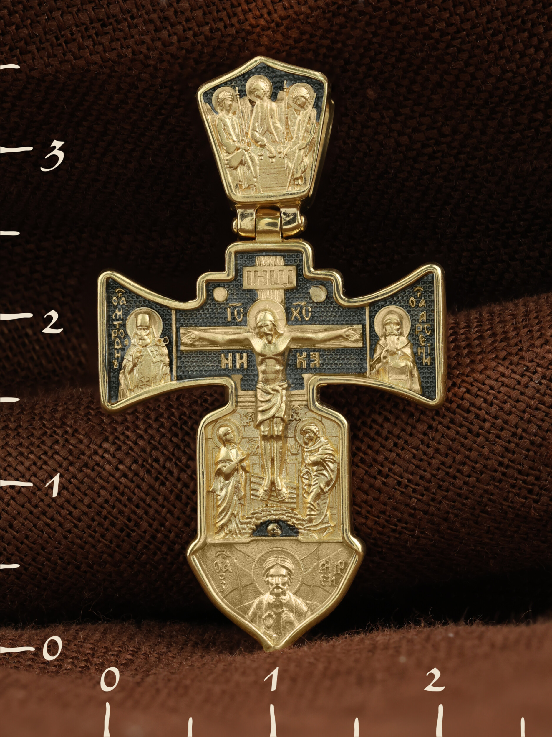 На лицевой стороне креста изображено Распятие Господа Иисуса Христа.
