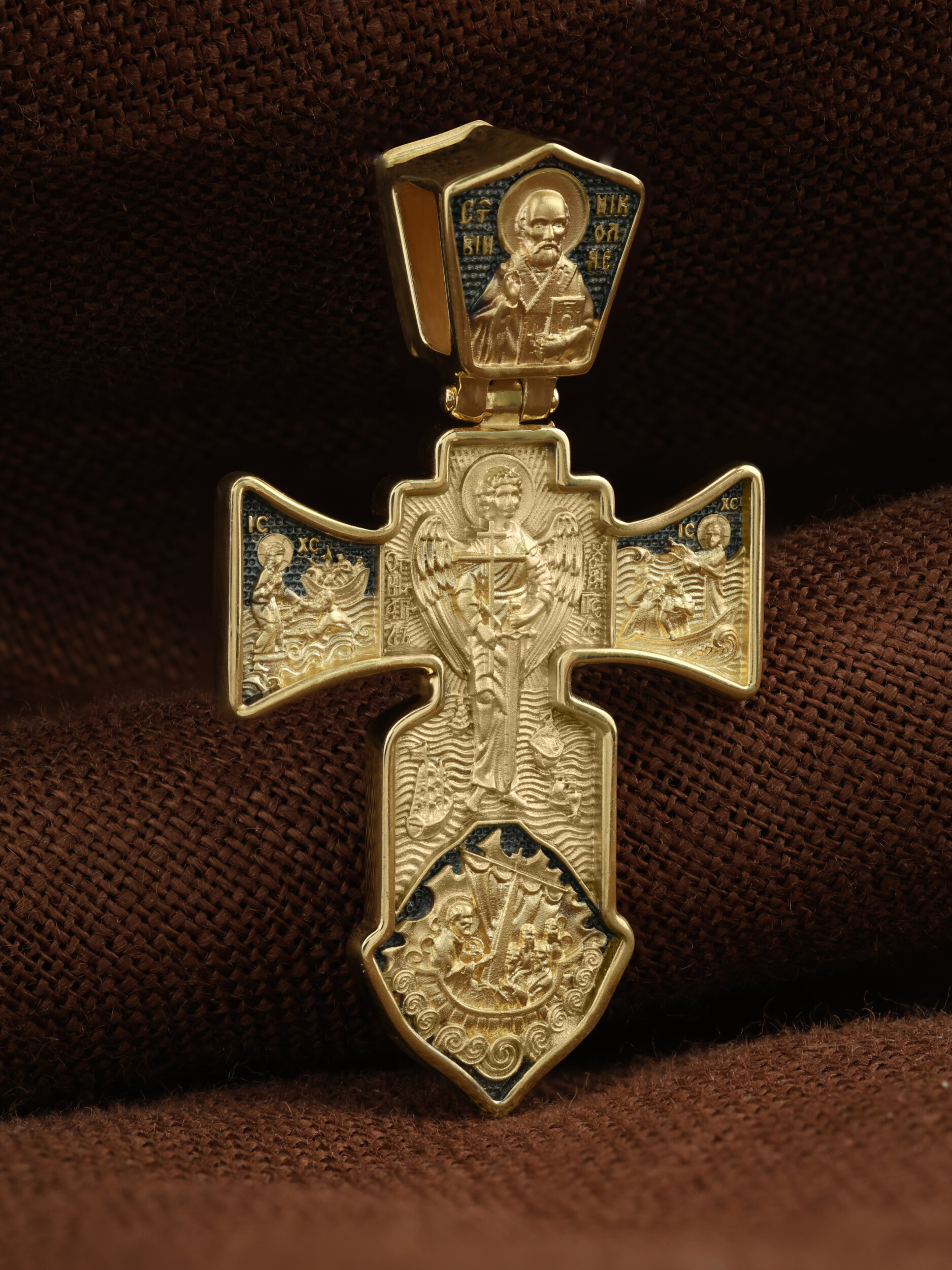 В кулонном кольце изображена икона Николая Чудотворца. В нижней же части — известное чудо святого спасение корабля в бурю.