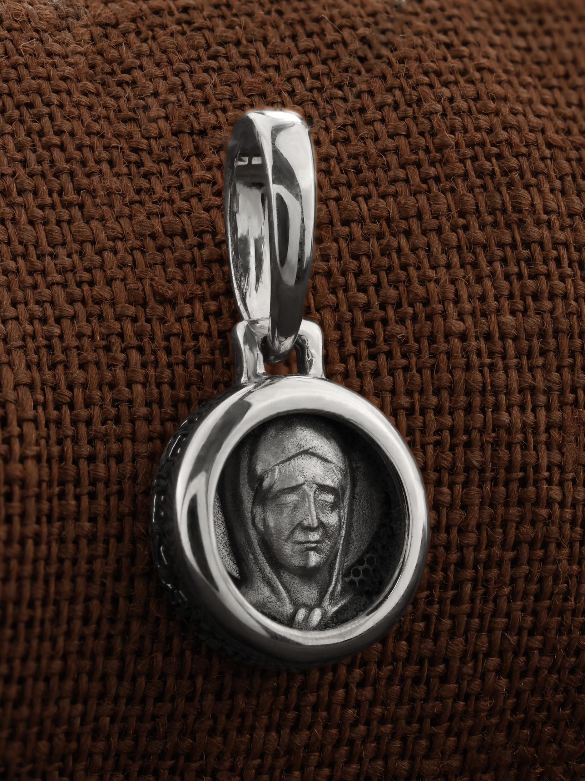 На лицевой стороне образка изображена Святая Матрона Московская. Родилась блаженная Матрона (Матрона Дмитриевна Никонова) в 1881 г. в деревне Себино Тульской губернии, недалеко от знаменитого Куликова поля, в бедной, но благочестивой крестьянской семье. Кроме Матроны, в семье уже было трое детей: двое братьев и сестра. Поэтому мать Матроны решила отдать будущего ребенка в приют, но увидела вещий сон. Еще не родившаяся дочь явилась ей во сне в виде белой птицы с человеческим лицом и закрытыми глазами и села ей на правую руку. Приняв сон как знамение, богобоязненная женщина отказалась от мысли отдать ребенка в приют. Дочь родилась слепой, но мать любила свое «дитя несчастное».