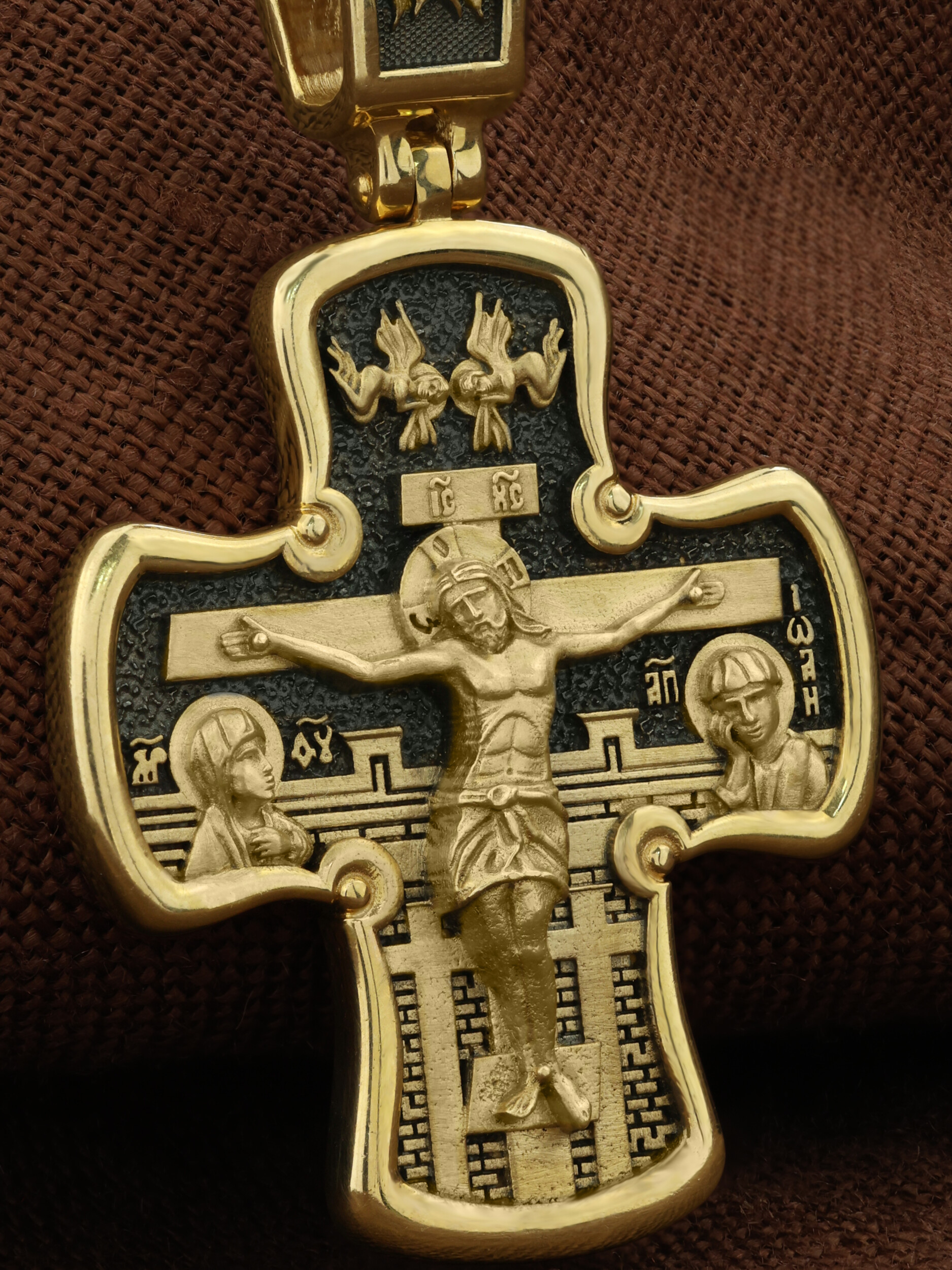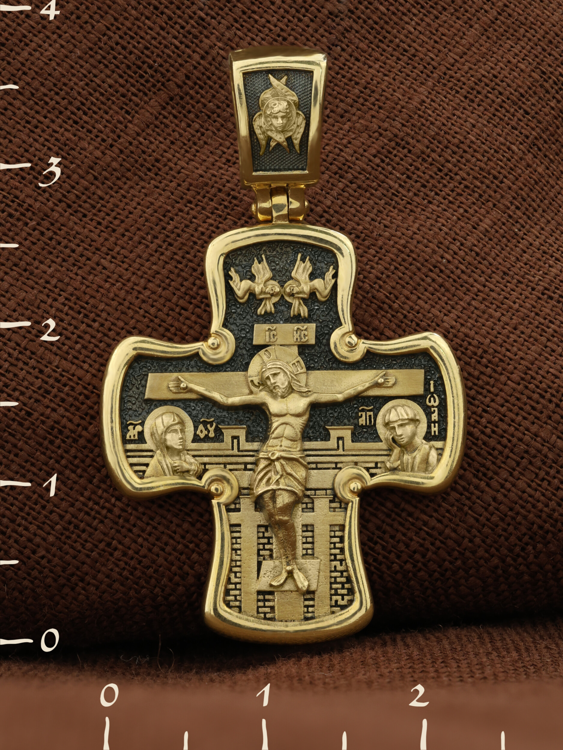 Лицевая сторона креста по канону посвящена Господу Иисусу Христу. Чаще всего на нательных крестах изображается Распятие, которое символизирует победу над грехом и смертью. Своими страданиями Господь искупил грехи человечества: умерев и сошествовав во ад, Он победил дьявола, освободил души праведников от вечной смерти и открыл им Небесные врата рая. Жертва Христа сделала возможным спасение для каждого человека. Поэтому на православных крестах Господь изображается не страдающим, а словно возносящимся и обнимающим весь мир. Он — Спаситель человечества, поправший смертию смерть и призывающий к Себе «все концы земли» (Ис. 45, 22). С двух сторон от Христа изображаются Его Мать, Пресвятая Богородица, и любимый ученик, апостол Иоанн Богослов. Они стояли у Креста неотлучно до самого конца, пока Господь не предал дух Свой Небесному Отцу. Позади — Иерусалимская стена. На иконах она обозначает место казни и символизирует Небесный Иерусалим, путь в который открылся для человечества через Голгофу.