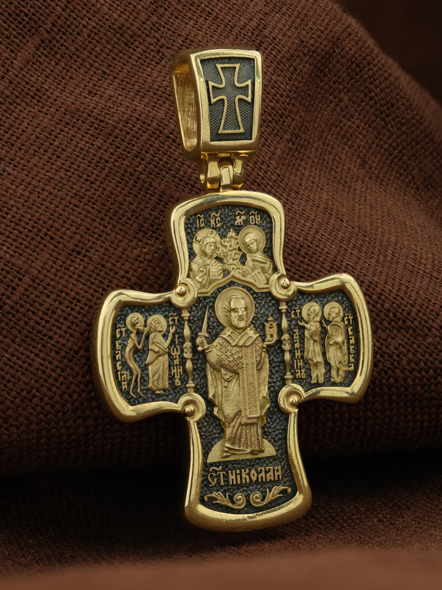 На обороте креста помещена икона самого почитаемого на Руси Святого — Николая Чудотворца (втор. пол. III в.).В руках Они держат знаки епископского достоинства. Чудотворец получил омофор и Евангелие лично из рук Богородицы и Спасителя как защитник и проповедник веры. С двух сторон от Святителя Николая помещены образы великих московских святых, прославившихся чудесами на всю Россию. Слева стоят Христа ради юродивые XVI века: Василий Блаженный, в честь которого назван самый знаменитый русский собор на Красной площади в Москве, и Иоанн Большой Колпак, блаженный, который похоронен в этом храме вместе с Василием Блаженным. Слева — преподобные чудотворцы Даниил Московский, младший сын Александра Невского, и Савва Сторожевский. Оба святых были основателями великих русских монастырей XIV века — Свято-Данилова в Москве и Саввино-Сторожевского в Звенигороде.
