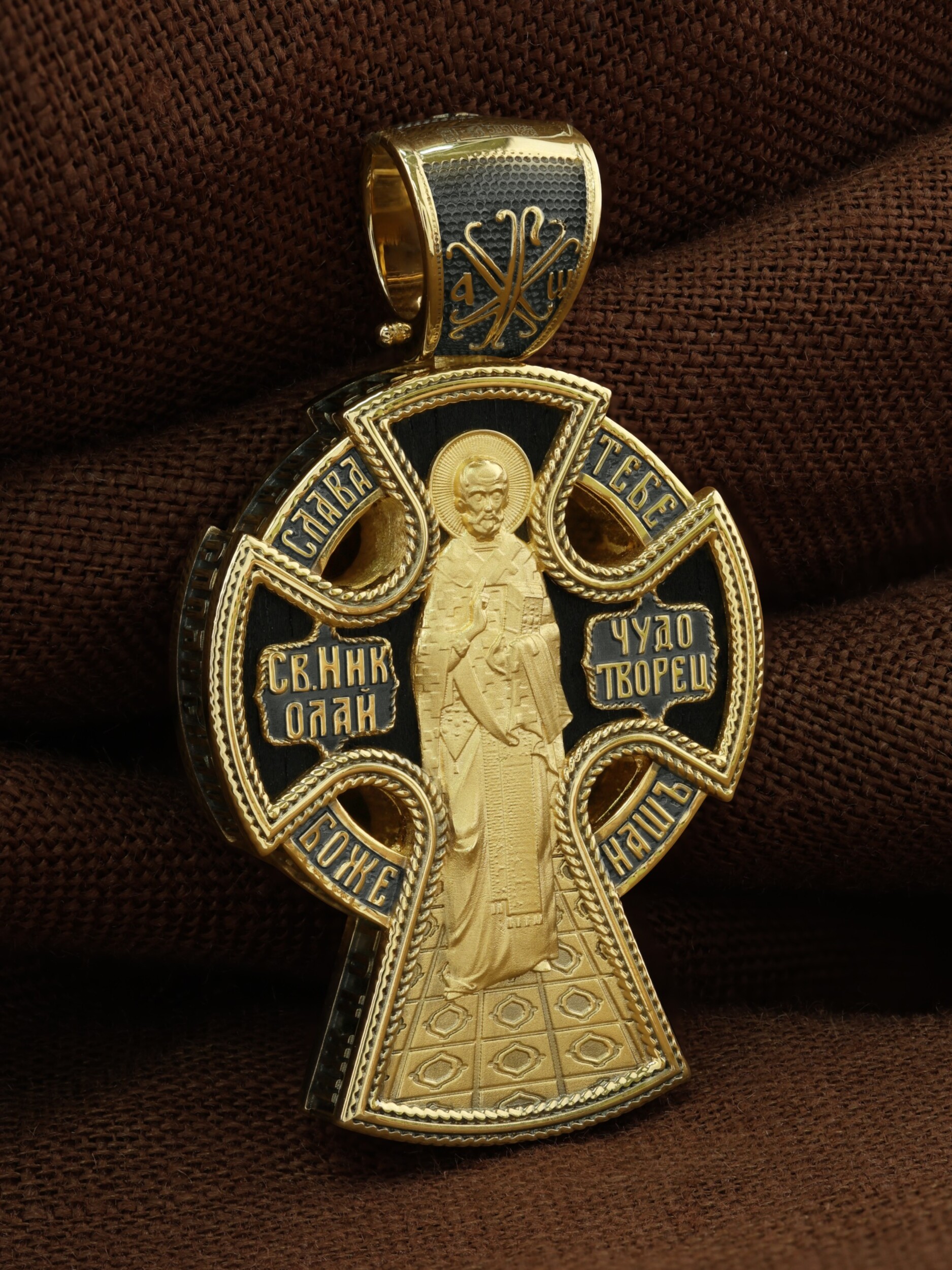 На оборотной стороне креста изображен Святитель Николай Чудотворец, архиепископ Мир Ликийских. Он является одним из самых почитаемых святых в православном мире. Вся жизнь святого Николая — это служение Богу. Из¬бран¬ник Бо¬жий Ни¬ко¬лай стал вершиной всех доб¬ро¬де¬те¬лей, под¬ня¬той до рай¬ской вы¬со¬ты. Чудес его исчислить невозможно. Николай Чудотворец подавал многим исцеления в болезнях и телесных недугах. Обогащал бедствующих в крайней нищете, подавал голодным пищу и всем являлся во всякой нужде готовым помощником, скорым предстателем и защитником. Помогал людям в бедах, спасал от потопления, освобождал из плена и избавлял от смерти. По кругу Креста размещена молитва: «Слава Тебе Боже наш».