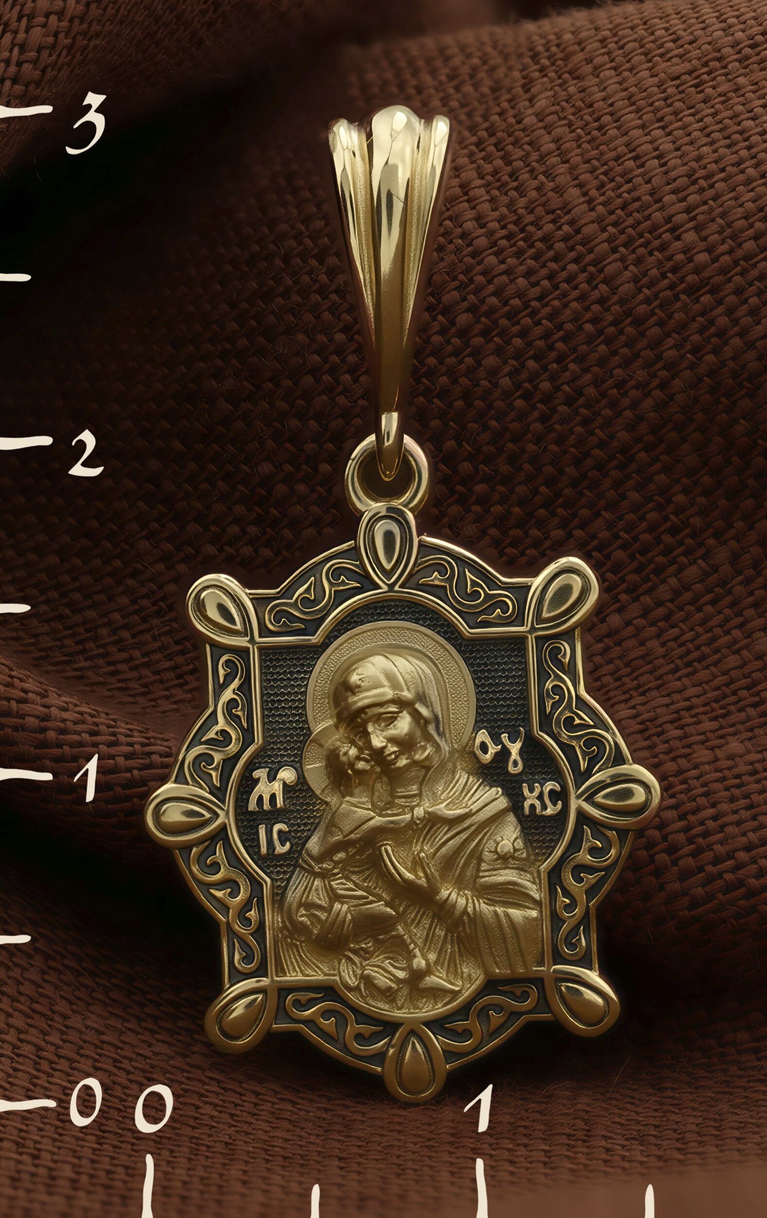 Лицевую сторону возглавляет Владимирская икона Божией Матери — самая великая русская святыня, многие века бывшая олицетворением нашей земли. Перед ней венчались на царство государи, избирались патриархи. Пречистой Богородице Владимирской клялись в верности Отечеству солдаты и за нее умирали на поле брани. Именно на ее защиту более всего уповала Россия в самые страшные периоды своей истории. Владимирская икона Божией Матери, по преданию, была написана на доске трапезного стола из дома Иисуса Христа. На Русь она была привезена в начале XII века и с тех пор почитается как главная святыня нашего Отечества. Перед ней молитвенно просят Богородицу об исцелении от телесных недугов, в частности, заболеваний сердца и сердечнососудистой системы. За помощью к ней обращаются во время бедствий, когда нуждаются в защите от врагов.