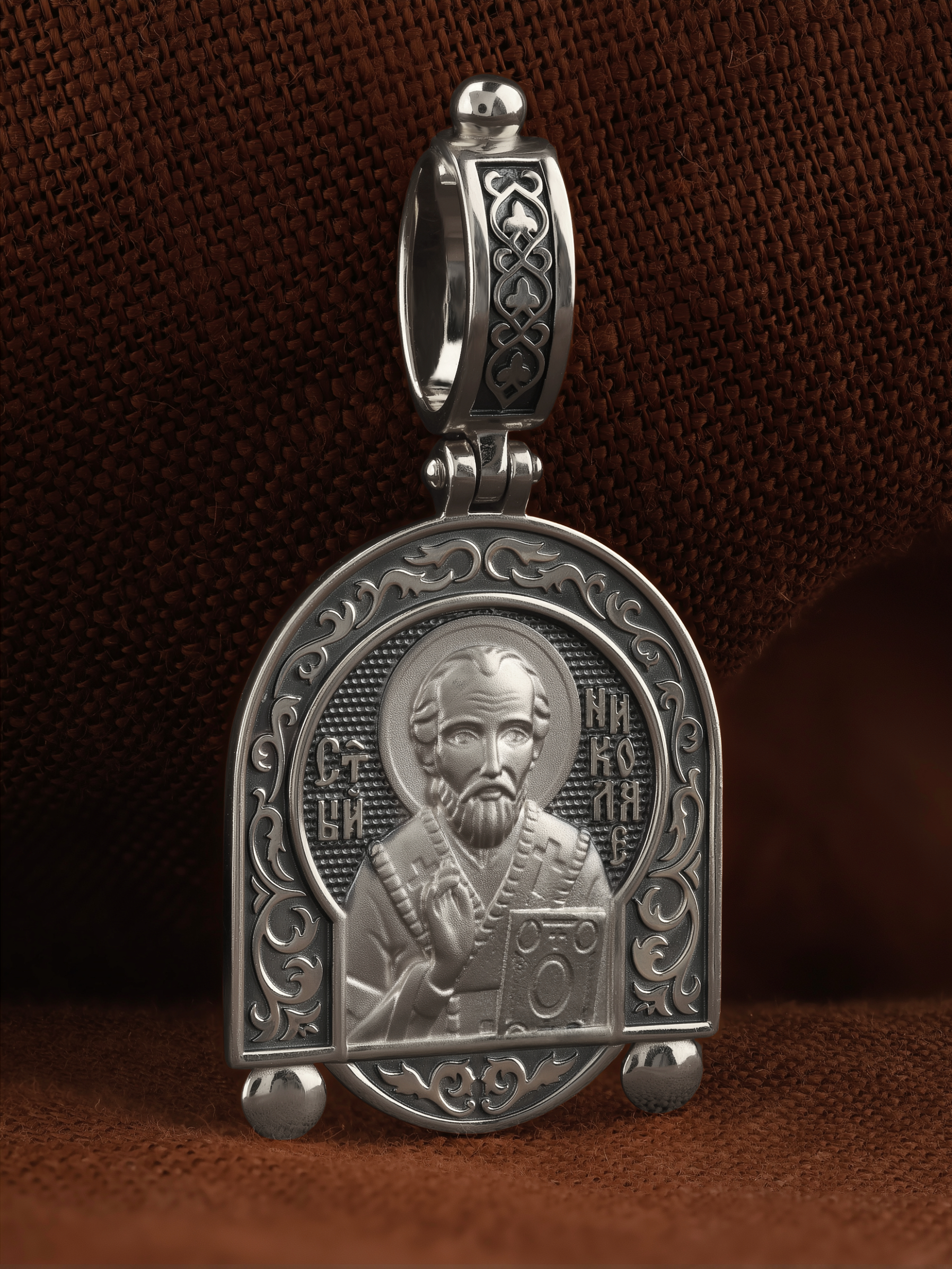 На лицевой стороне образка изображен Святитель Николай архиепископ Мир Ликийских, Чудотворец. Он является одним из самых почитаемых святых в православном мире. Святитель Николай родился во второй половине III века в Малой Азии в Ликийском городе Патары. С рождения Божий Угодник проявлял необыкновенные дарования. Сохранилось Предание, что во время крещения он, никем не поддерживаемый, простоял в купели три часа. Приняв сан священника, святитель Николай стал проводить еще более строгую подвижническую жизнь. Избранник Божий Николай стал вершиной всех добродетелей, поднятой до райской высоты. С кем из величайших праведников не сравнялся он образом духовной красоты, кому из них не последовал в своих деяниях и чудотворениях? Вся жизнь святого Николая — это служение Богу. Много великих и преславных чудес сотворил великий Святитель Николай Угодник. Он помогал сущим в бедах, укрощал штормы, спасал от потопления и выносил на сушу из глубины морской, освобождал из плена и приносил освобожденных домой, избавлял от уз и темницы, защищал от посечения мечом, освобождал от смерти и подавал многим различные исцеления: слепым — прозрение, хромым — хождение, глухим — слух, немым — дар слова.