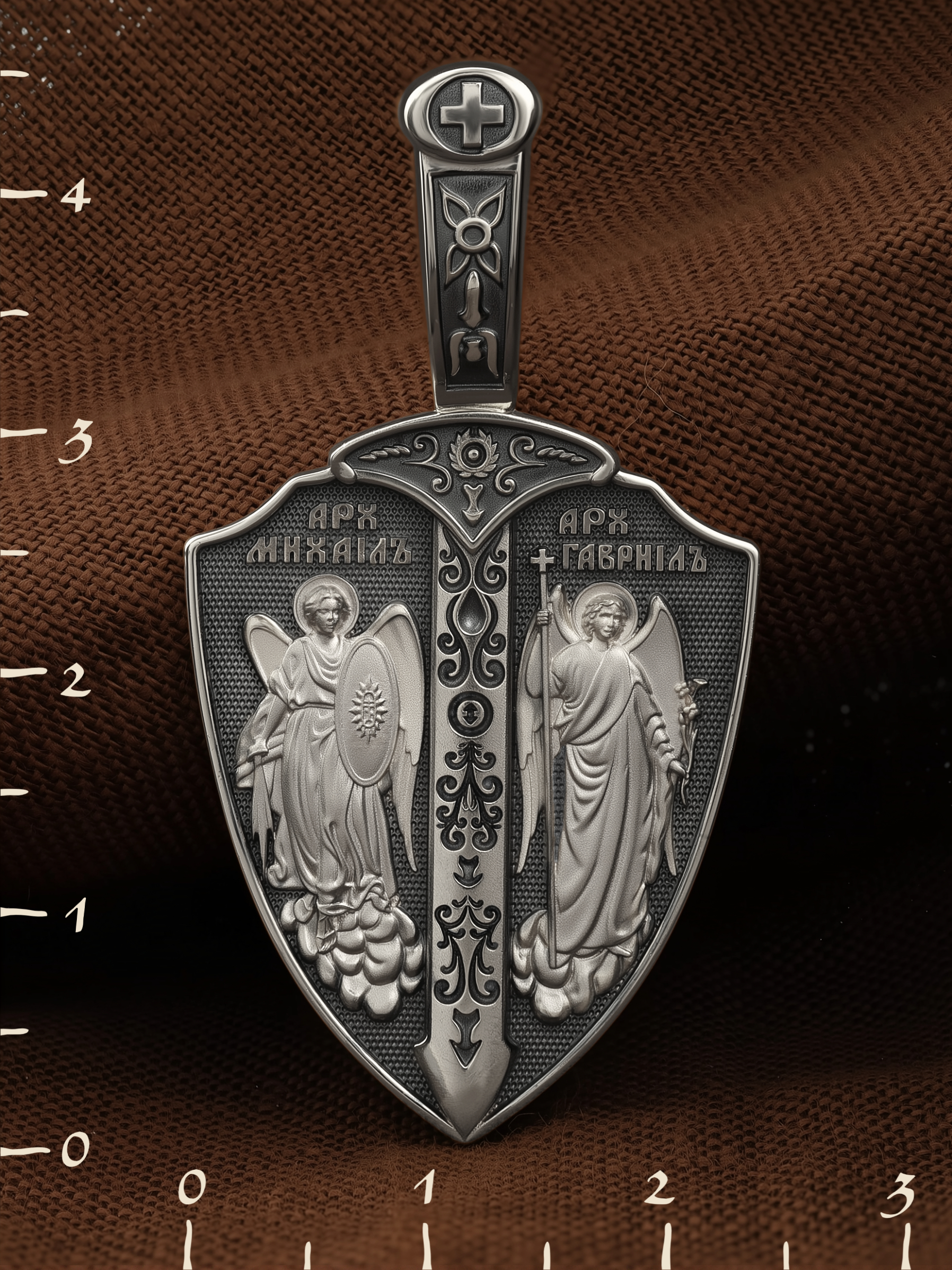 Образок выполнен в виде воинского щита и меча. На лицевой стороне образка изображены Архангел Михаил и Архангел Гавриил. Архангел Михаил изображен в воинственном виде с огненным мечом в правой руке и щитом в левой руке. Архангел Михаил — верный служитель Божий, который низринул с Неба возгордившегося денницу с другими павшими духами. В Православии его называют Архистратигом, что означает глава святого воинства Ангелов и Архангелов. Архангел почитается как покровитель воинов и всех верных Богу и ведущих борьбу против сил зла, борец против ересей, а также защитник душ умерших, страж райских врат. Архангел Гавриил изображен с крестом в правой руке и цветком лилии в левой руке. Он несколько раз упоминается в Писании, как Небесный вестник, которого Бог посылает, чтобы возвестить людям Свои планы о спасении рода человеческого. Так, Архангел Гавриил несколько раз являлся пророку Даниилу и раскрывал ему тайны пришествия Мессии, гонений антихриста и конца мира (Дан. 8, 16, 9−21). Перед пришествием Сына Божия в мир архангел Гавриил явился в храме старцу Захарии и сообщил ему о чудесном зачатии Предтечи. Через шесть месяцев он явился в Назарете Деве Марии с вестью об избрании Ее быть Матерью Христа Спасителя (Лк. 1). Когда Господь перед Своими страданиями молился в Гефсиманском саду до кровавого пота, на укрепление Его, по Церковному Преданию, был послан с Небес Архангел Гавриил. (Лк.22:43). Жены мироносицы услышали от Архистратига радостную весть о Воскресении Христовом.