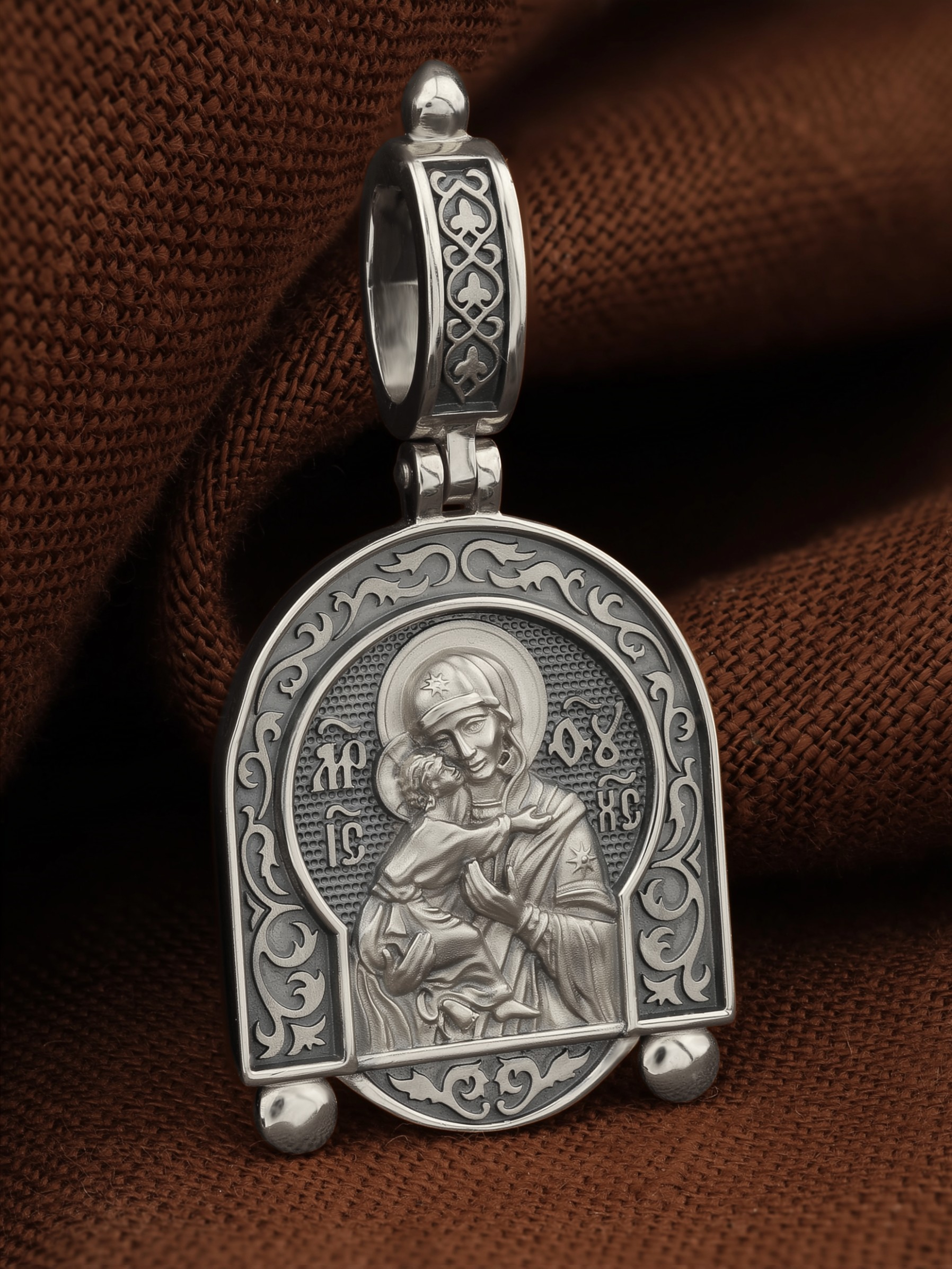 Лицевую сторону возглавляет Владимирская икона Божией Матери — самая Великая русская Святыня, многие века бывшая олицетворением нашей земли. Перед ней венчались на царство государи, избирались патриархи. Пречистой Богородице Владимирской клялись в верности Отечеству солдаты и за нее умирали на поле брани. Именно на ее защиту более всего уповала Россия в самые страшные периоды своей истории. Владимирская икона Божией Матери, по преданию, была написана на доске трапезного стола из дома Иисуса Христа. На Русь она была привезена в начале XII века и с тех пор почитается как главная святыня нашего Отечества. Перед ней молитвенно просят Богородицу об исцелении от телесных недугов, в частности, заболеваний сердца и сердечнососудистой системы. За помощью к ней обращаются во время бедствий, когда нуждаются в защите от врагов.