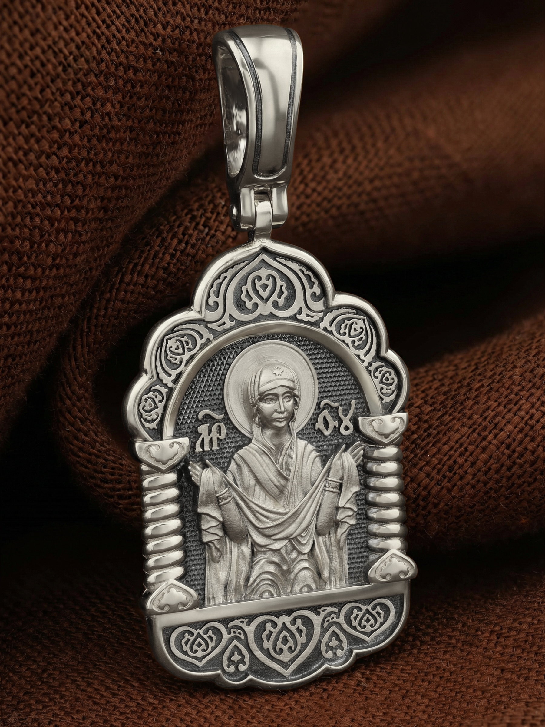 На лицевой части образка изображена икона Покров Пресвятой Богородицы. Праздник Покрова Божией Матери является воспоминанием чуда, которое произошло во Влахнернской церкви 1 (14) октября 910 года: Пресвятая Богородица явилась верующим над алтарем храма и распростерла над ними Свое покрывало. В этот день Божья Матерь открыла людям, что Она является Ходатаицей за них перед Богом. Богородица простирает Свой молитвенный покров над всеми православными христианами и умоляет Сына Своего о даровании вечного спасения каждому человеку