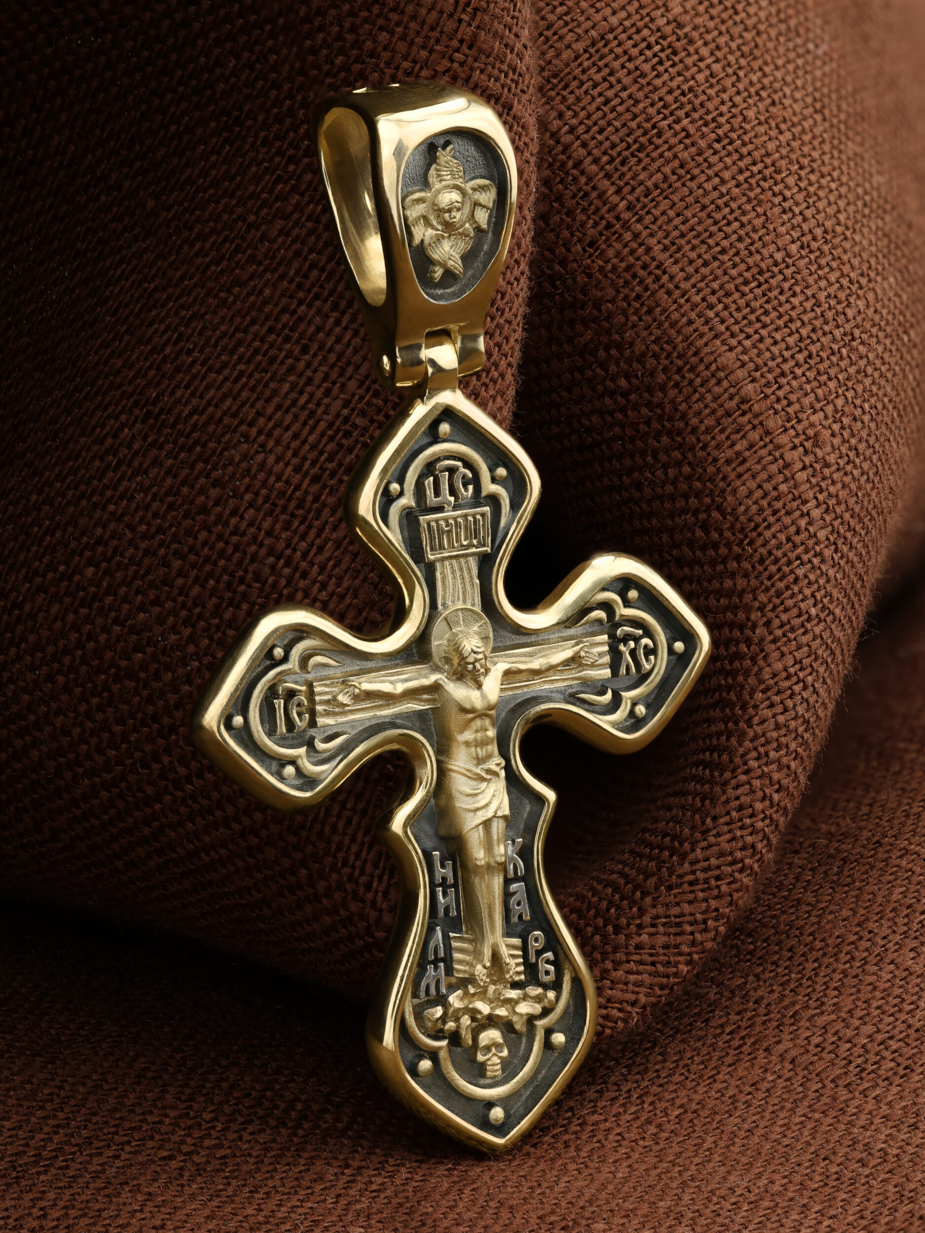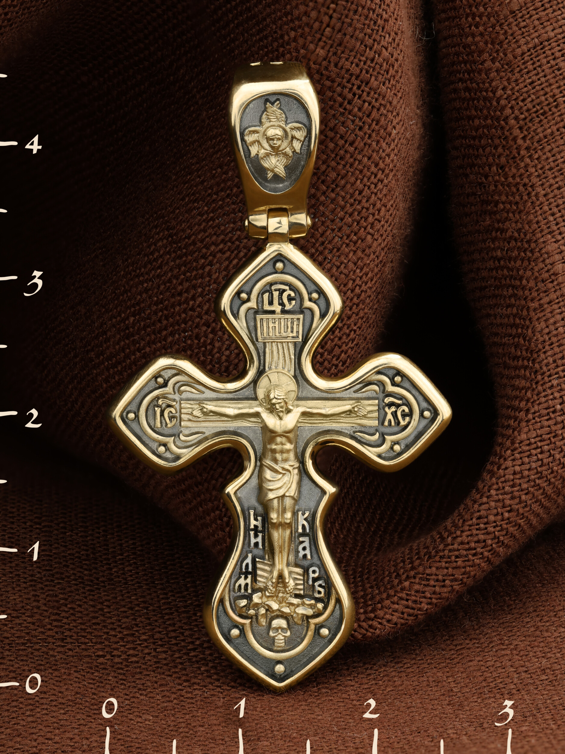 Господь на кресте изображен свободно покоящимся с простертыми руками, как бы обнимающим всю Вселенную. Он — Спаситель, поправший смертию смерть и призывающий к Себе «все концы земли», поэтому рядом с Господом написано «НИКА», что значит «победитель». Это слово Господь произнес по воскресении, обращаясь к ученикам: «Дерзайте, яко Аз победил мир». По бокам простертых рук Господа написаны титлы Его Святого имени «IC XC», а в верхней оконечности креста написаны буквы «ЦС», что значит «Царь Славы». В основании креста в виде скалистого пригорка изображена гора Голгофа с черепом Адама, обозначенная на кресте буквами «МЛРБ» (Место лобное Рай бысть»).