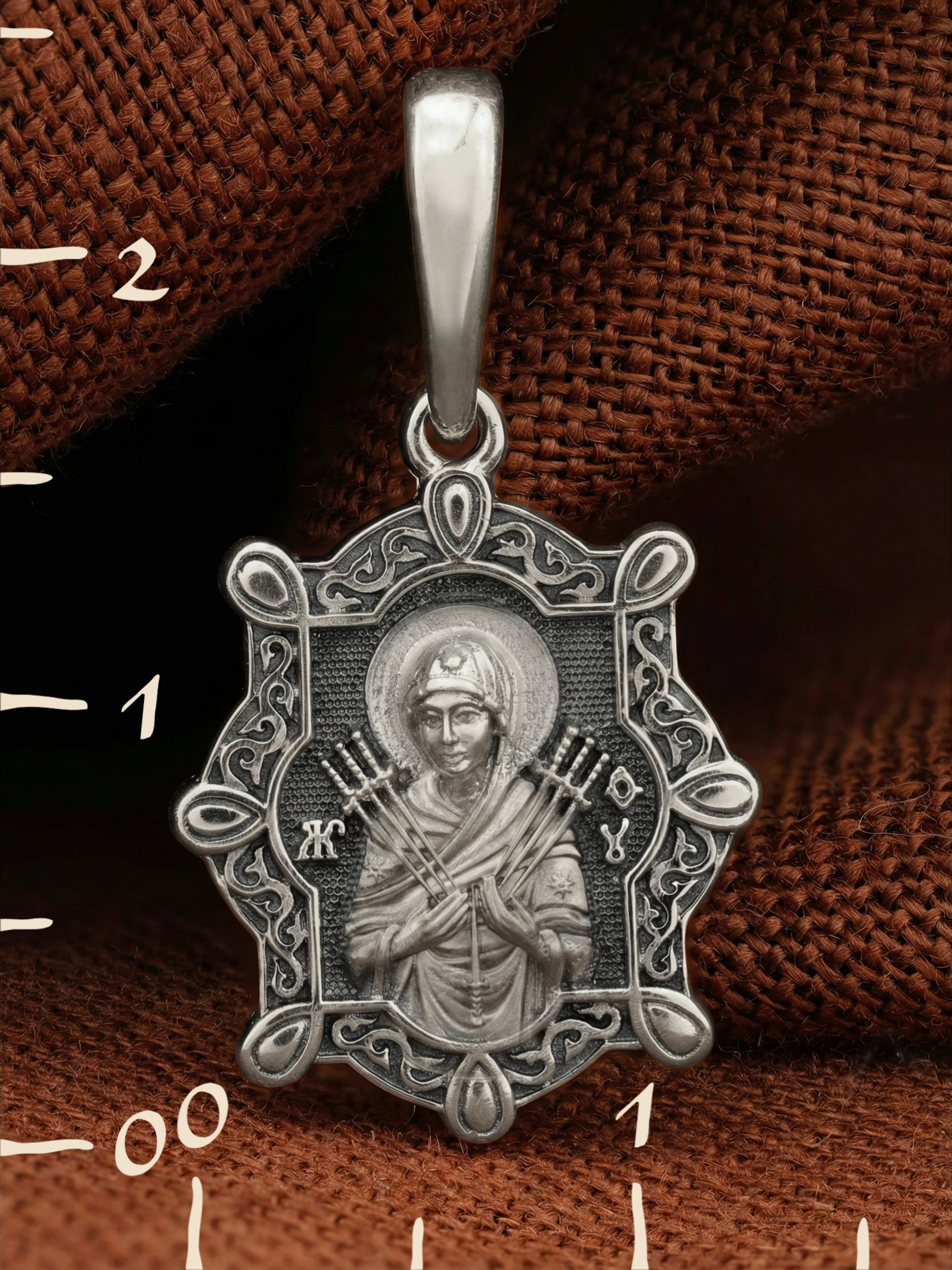 На лицевой стороне образка изображена икона Пресвятой Богородицы «Семистрельная» — одна из самых чудотворных икон на Руси. На протяжении многих веков христиане взывали к Царице Небесной через эту икону, если в стране начинались войны или мятежи.