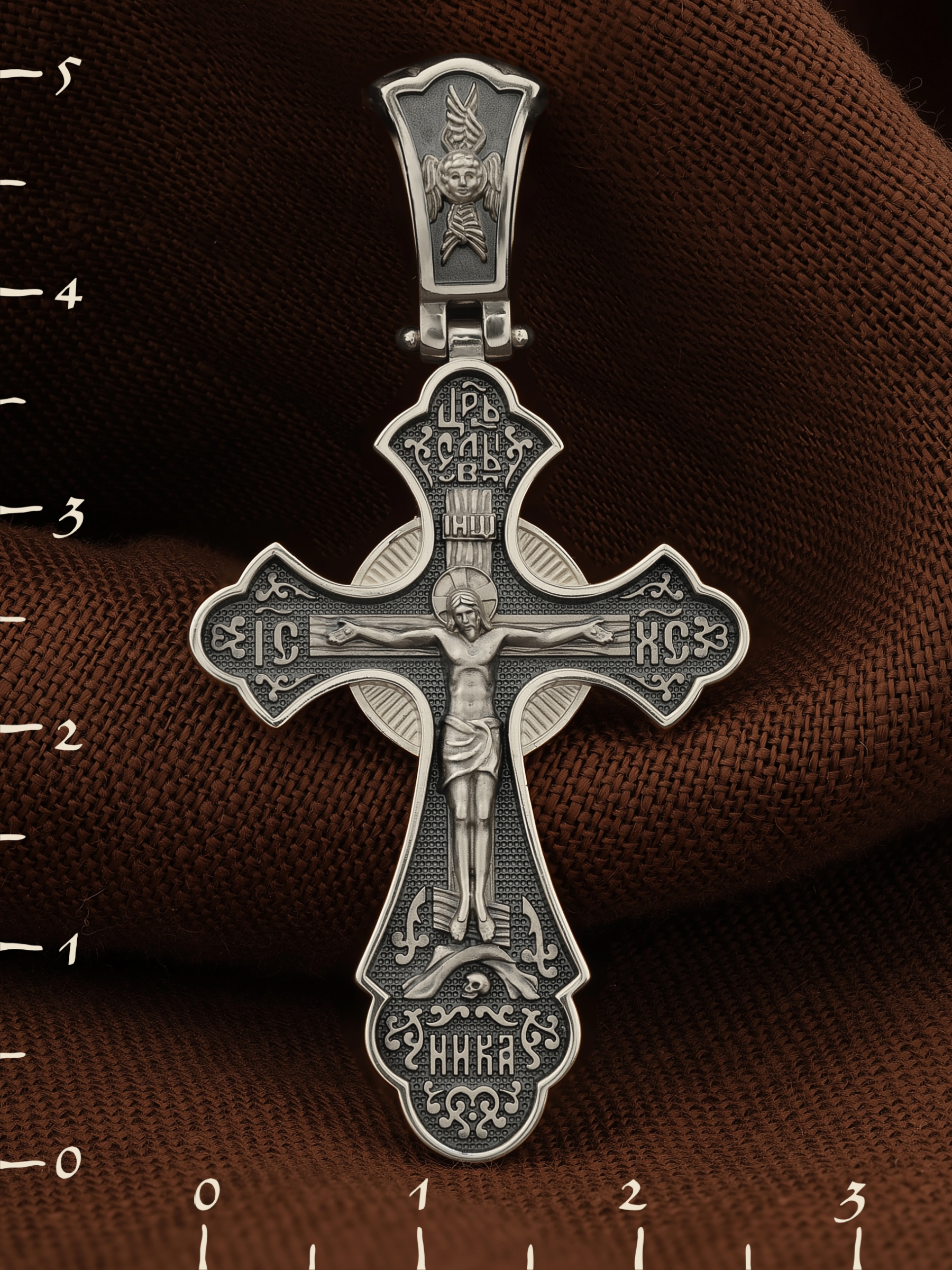 На лицевой стороне креста по каноническим правилам Церкви изображен Господь Иисус Христос. Сверху у изголовья Иисуса Христа размещена табличка с надписью в виде аббревиатуры ИНЦИ — «Иисус Назорей Царь Иудейский», которая, согласно Евангелию, была прибита к кресту после Распятия. У подножия креста Господа в виде скалистой горки изображена гора Голгофа с Главой Адамовой в пещере.