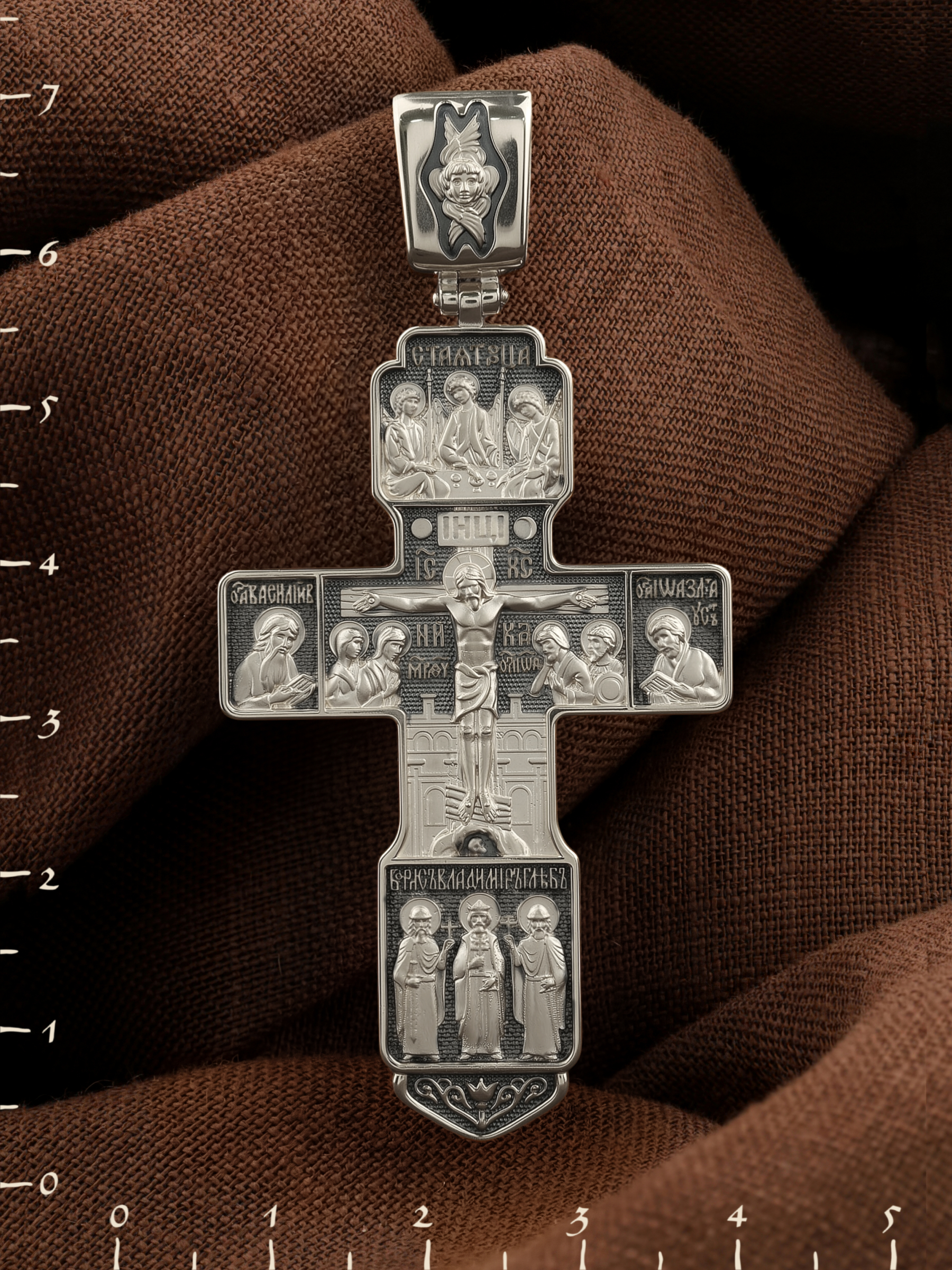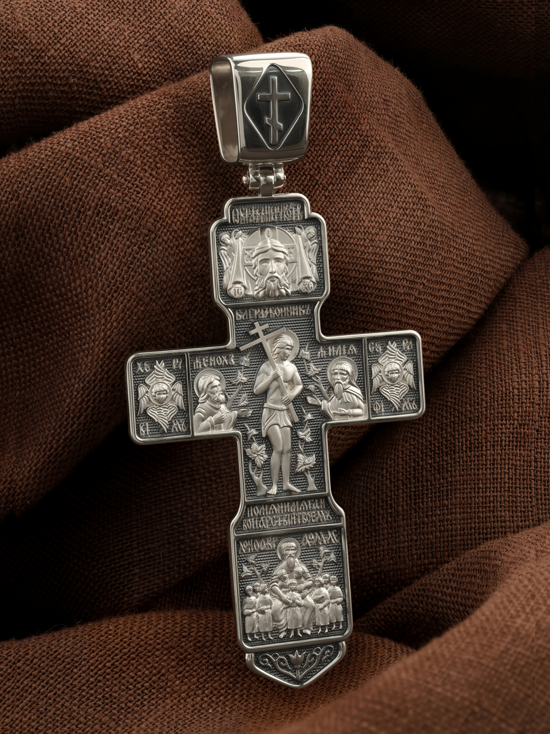 В нижней части креста изображены образы первых русских святых князей-мучеников — Бориса (князь ростовский) и Глеба (князь муромский) и святого равноапостольного князя Владимира. Страстотерпцам Борису и Глебу молятся об умиротворении Отечества, о добром нраве властей и правителей, о сохранении от междоусобицы, о даровании мужества перед лицом смертельной опасности. С Борисом и Глебом неразрывно связан образ их отца — святого равноапостольного князя Владимира, который также почитается как защитник и покровитель Русской Земли и Церкви. В молитвах его называют «отец русский» или «отец всея Руси».